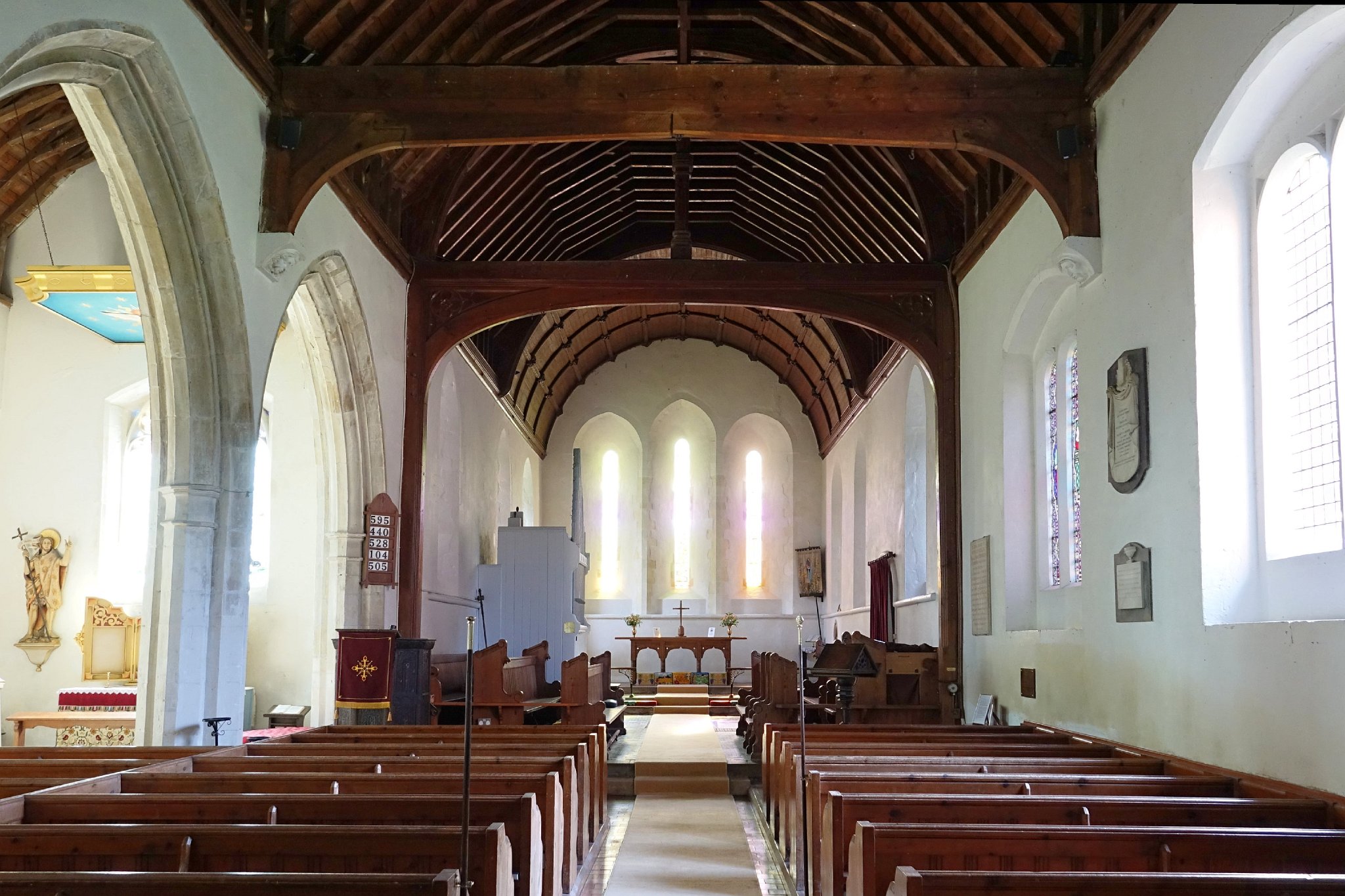 The thirteenth century nave and chancel of St Marys. The north aisle was added during the fifteenth century. More recently the church has become a world centre for commemorating the captivity and release of hostages everywhere and two new stained glass windows have been installed in recognition of this new role.