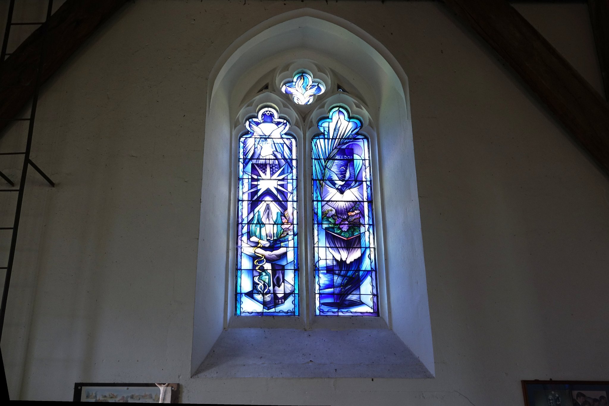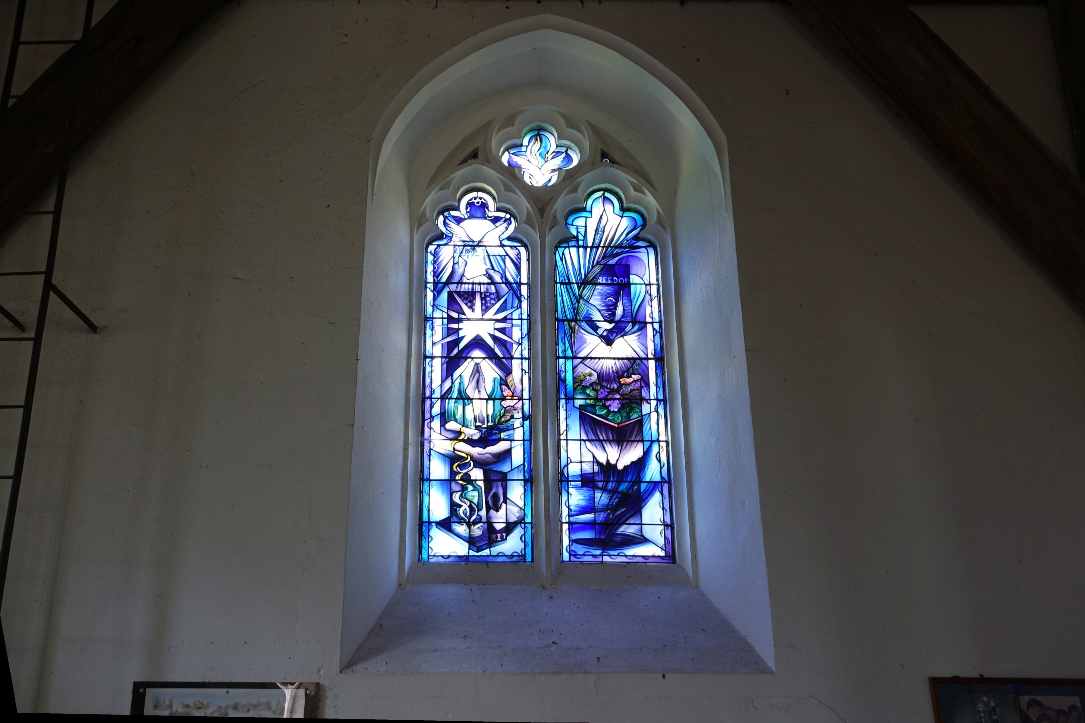 One of two windows by John K Clarke, 1993. The other window is in shades of grey and symbolises the capture of hostages; this blue one symbolises freedom. Broxted church became a world centre for commemorationg the captivity and release of the Beurut hostages, and now bears witness for hostages everywhere.
