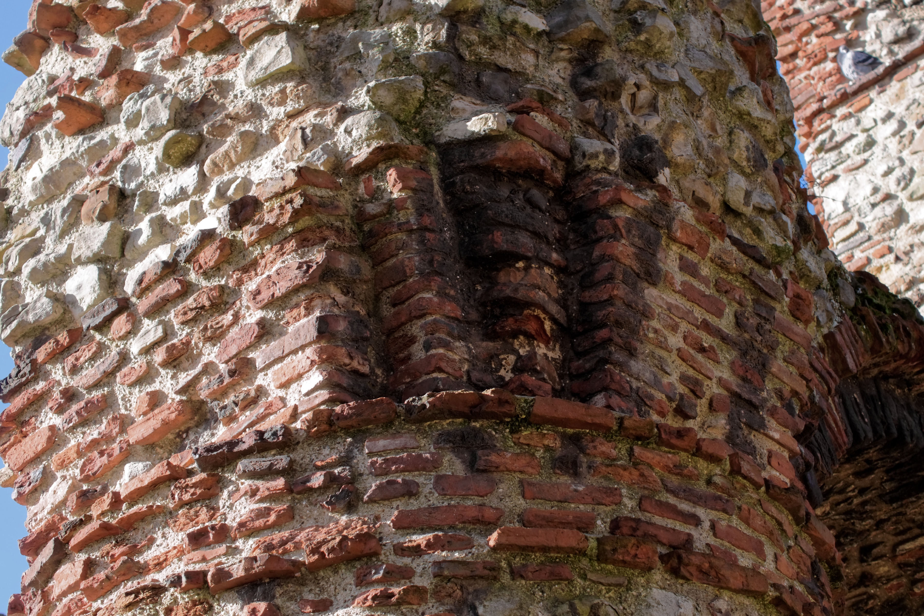 The massive circular piers of the nave are strengthened by several courses of brick.