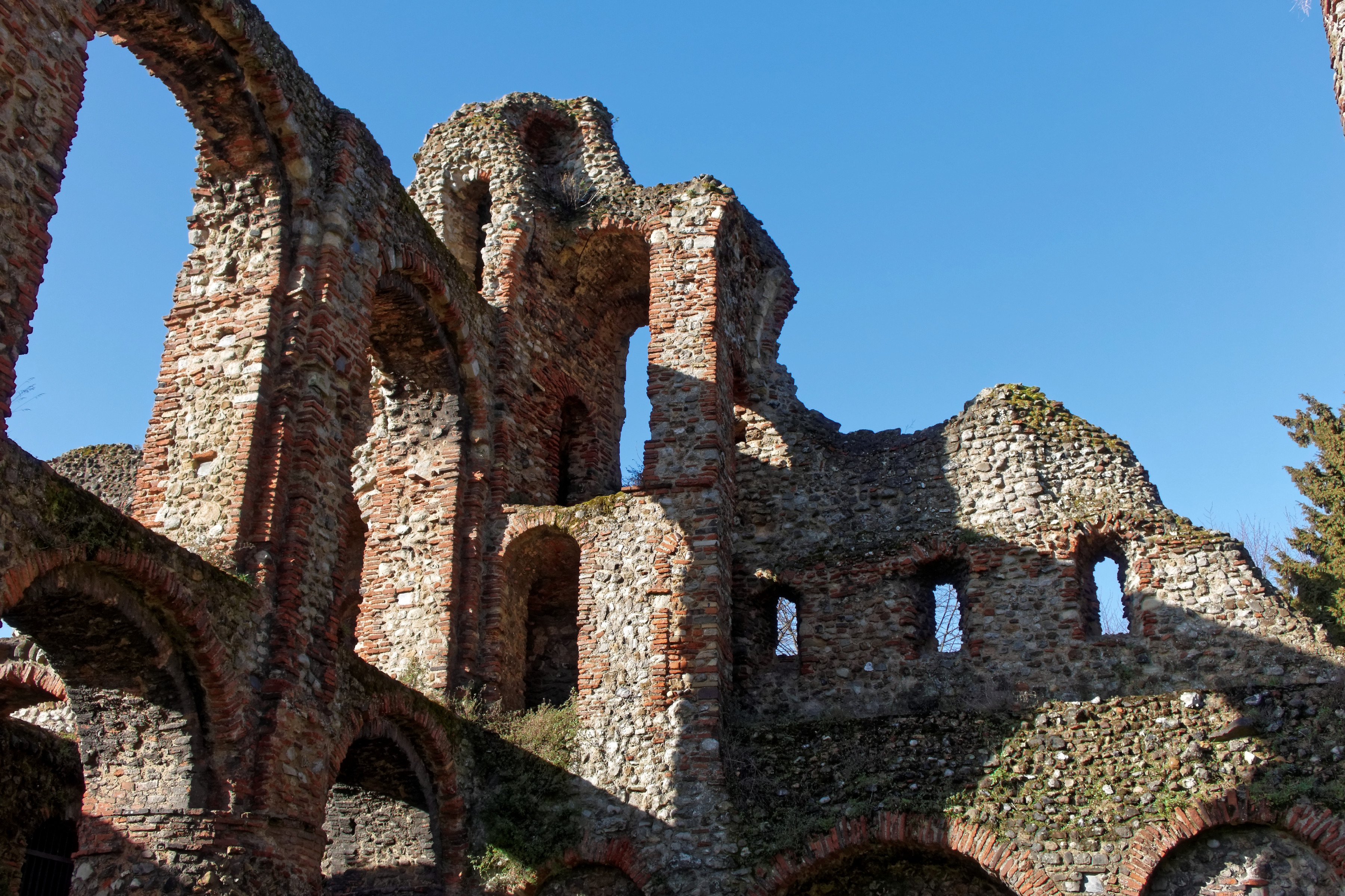 One of the two, non-identical towers at the west end of the priory. Up on the first floor, a walkway runs from one tower to the other.