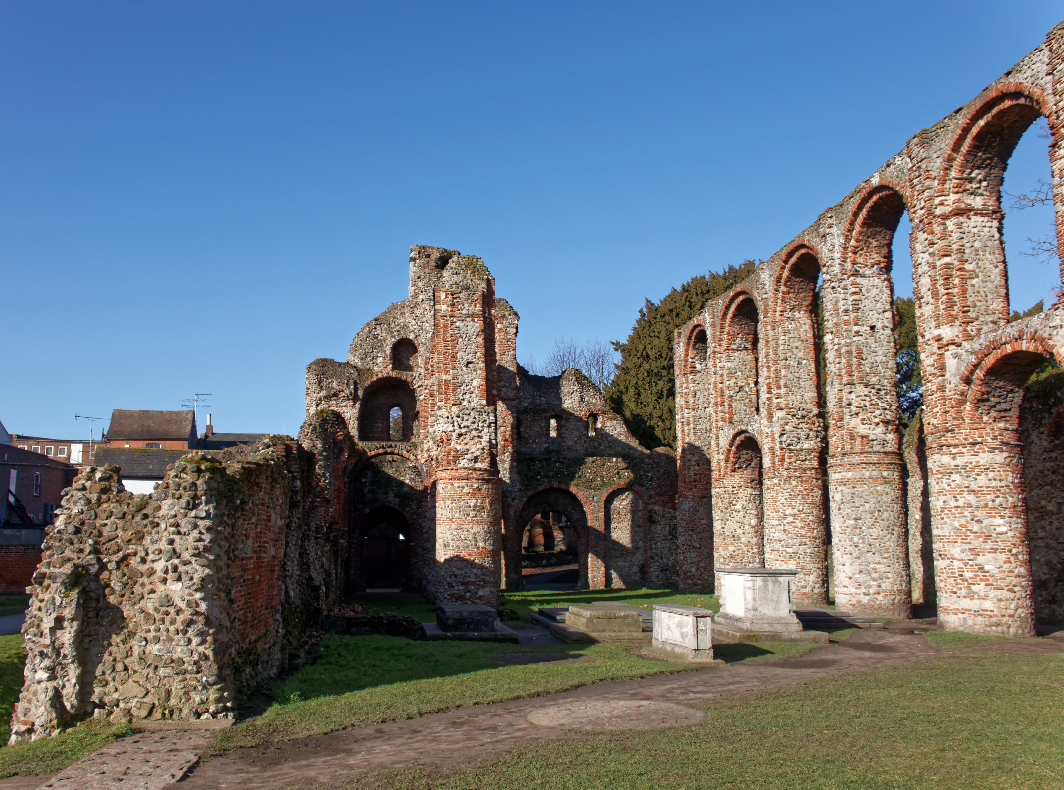 The ruins of St Botolph's Priory stand just outside the south east gate of Colchester's Roman wall. Built around 1100 AD, it was the first Augustinian priory established in England, and was dissolved in 1536 by Henry VIII. It continued in use as a parish church until the English Civil War when it was reduced to a ruin during the siege of Colchester in 1648.