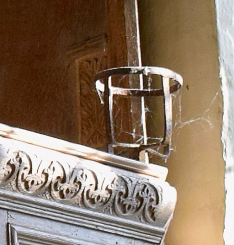 The pulpit is equipped with a simple wrought-iron hour-glass stand. In the the 17th century, the hour-glass was used to time to length of the sermon. Having a "second glass" was a sign of a preacher who had got carried away. There is also symbolism in its use: as the sands of time ran through the glass, the flock were reminded of their own time running out before their inevitable demise and Judgement..