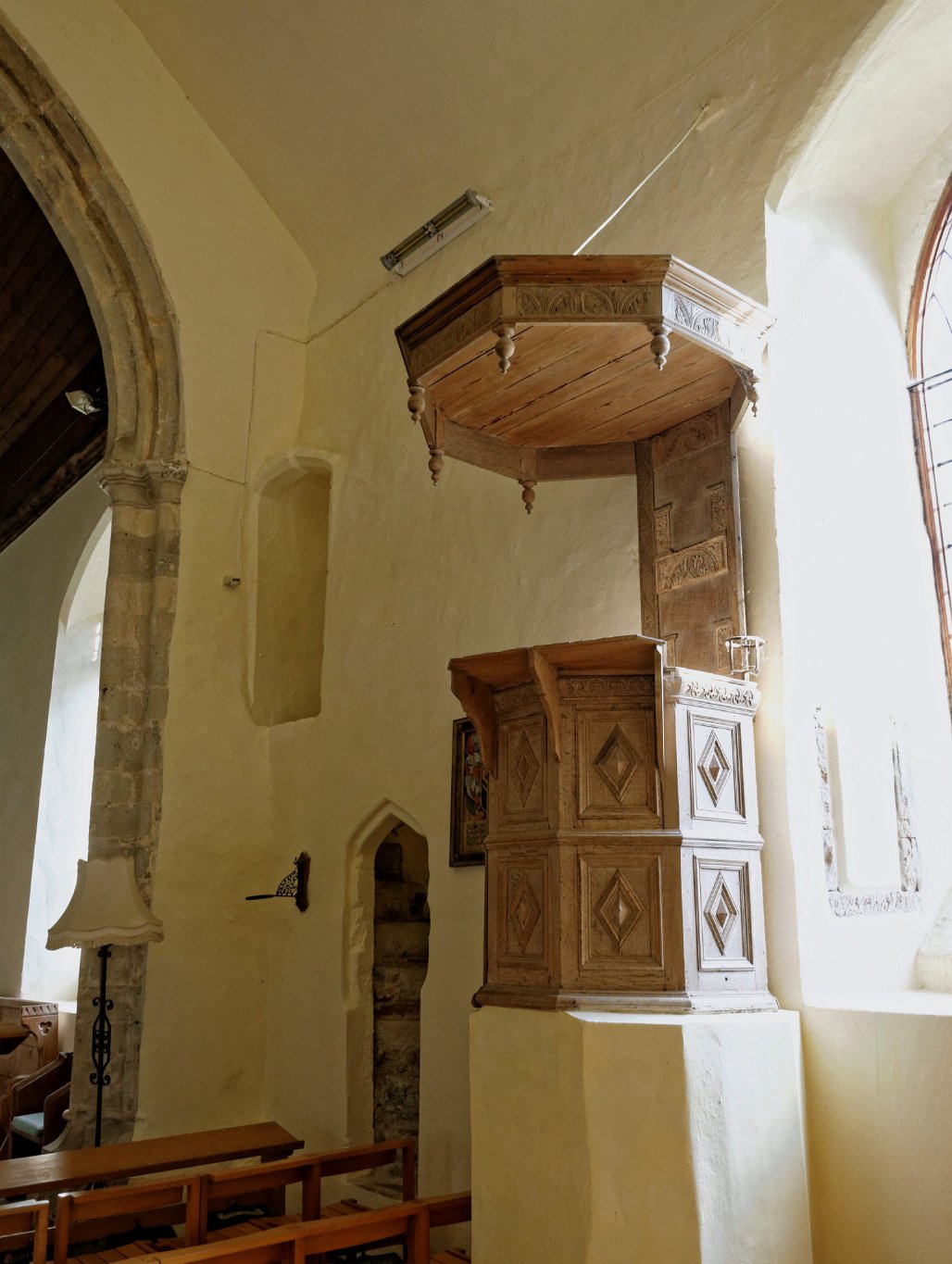 Internally much of the original interior of the church was destroyed by parliamentarian troops during the Civil war when they used the church as a barracks and stables. The lime-washed austerity of the post-Reformation years is still apparent, and the church has a simple devotional feel to it. Mounted high on a stone base on the south wall, the 17th Jacobean Pulpit and octagaonal sounding board ('tester') now has no visible means of access, after the box pews were removed in the 1920s.
