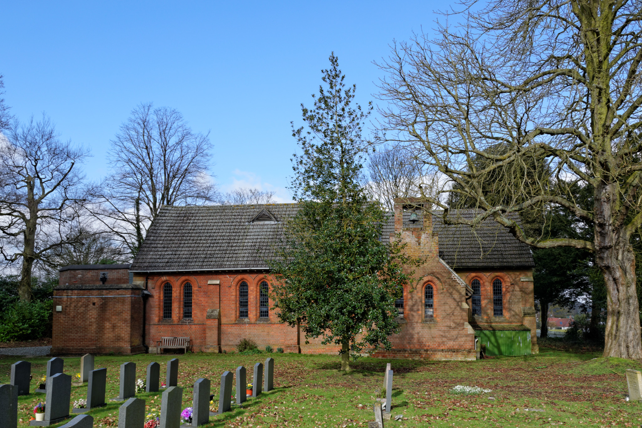 Lying 5 miles to the west of Colchester, Eight Ash Green is not a traditional English village but a civil parish formed in 1947 around a scattered collection of agricultural buildings. This small simple brick church was built alongside the main road in 1898 to serve as an outpost to the original parish of Copford.