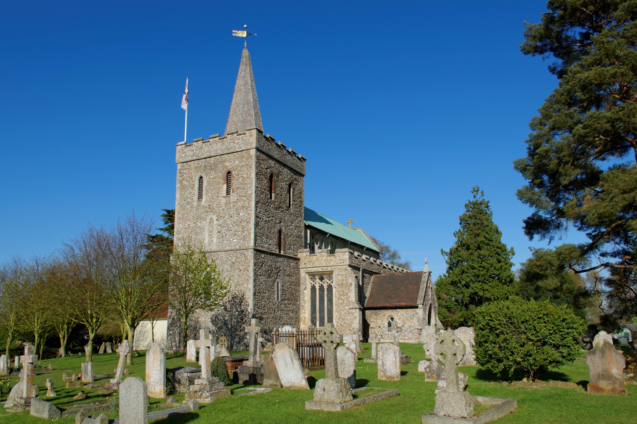 The tower is 12th or early 13th century with small lancet windows. The nave, chancel and north and south aisles are 14th century. It is Grade I listed.