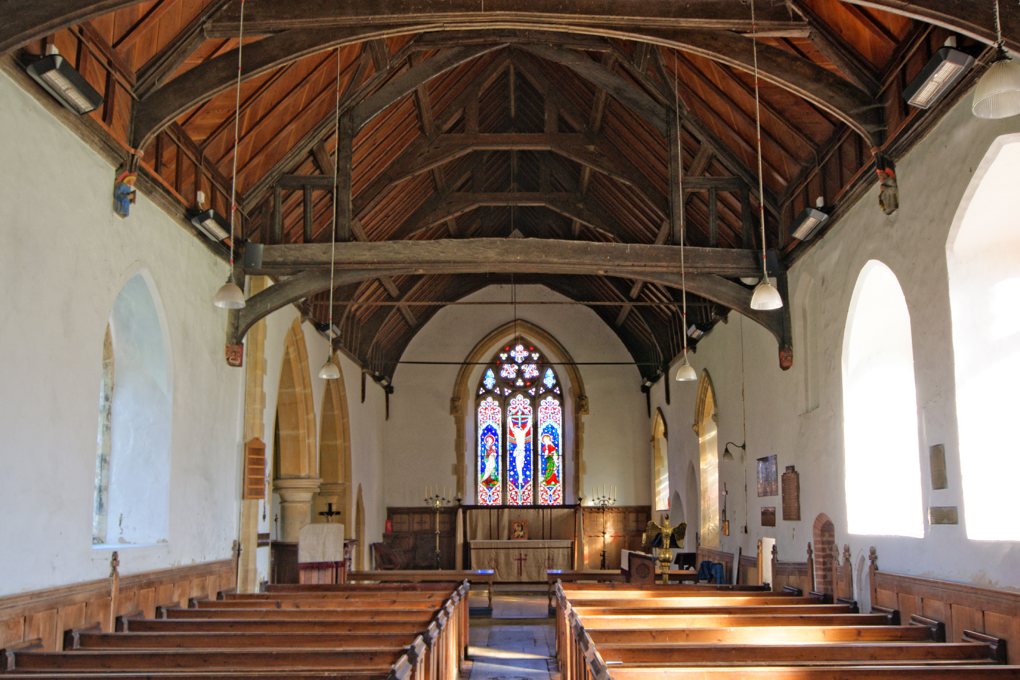 The 15th century nave roof has 3 arch-braced tie beams with queen posts alternating with 2 arch-braced collar beams. The 10 wooden corbels are carved and painted.