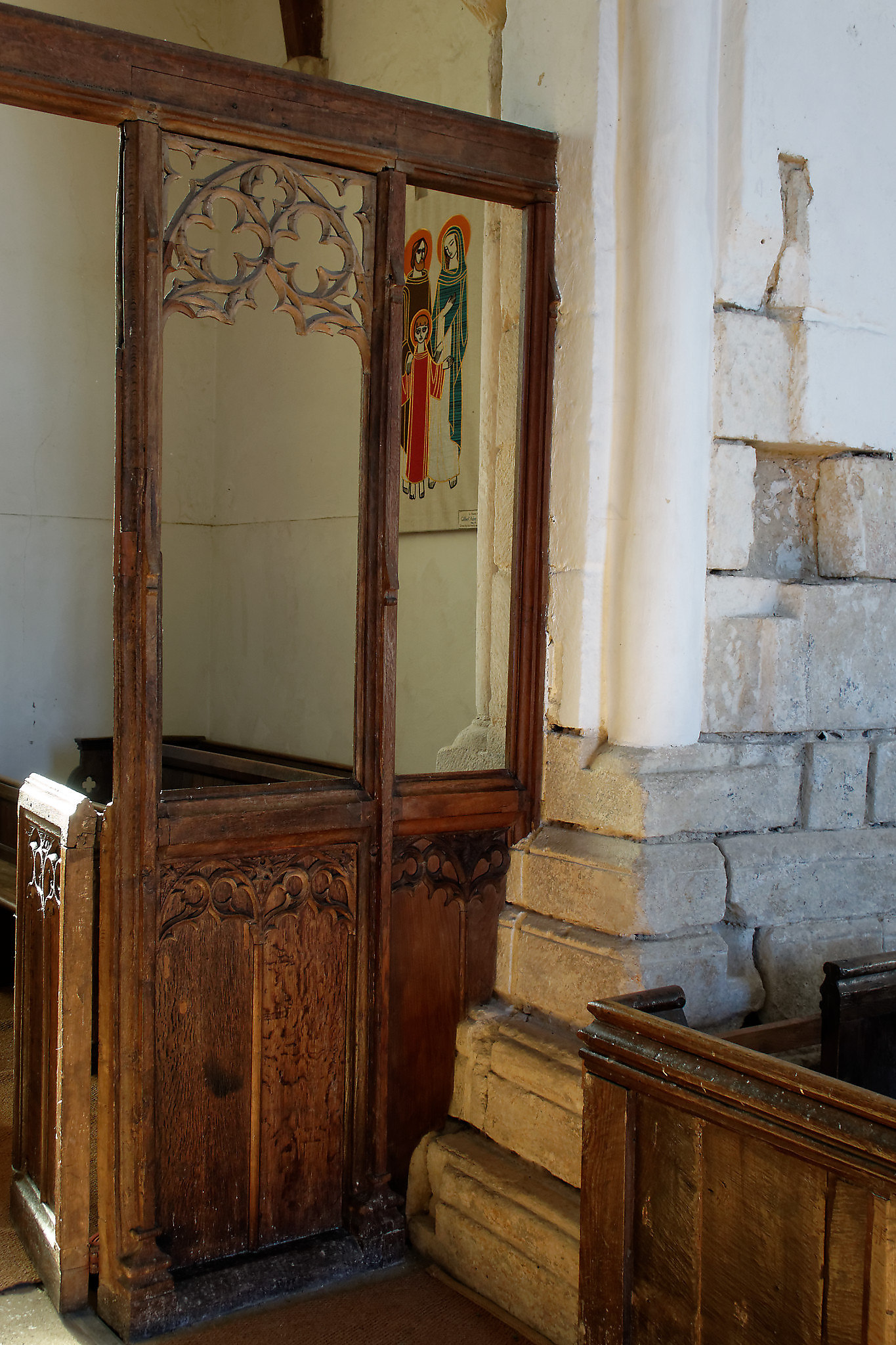 The screen leading to the south transept is 15th century. To the right is the base of the Saxon 11th century transept arch, which was rebuilt using the original stonework in the 13th century, following the collapse of the central tower. The arch has one order of colonettes and Saxon leaf carving on the abacus.
