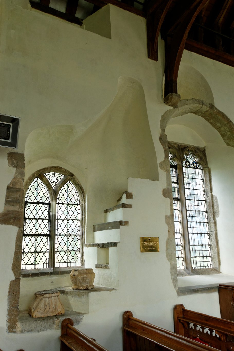 The rood stairs remain although the gilded rood, with statues of St John and St Mary either side of the crucifix no longer remain, having been burnt down by Protestant zealots in 1552, during the time of Edward VI. The Norman church door, with original ironwork, still remains.