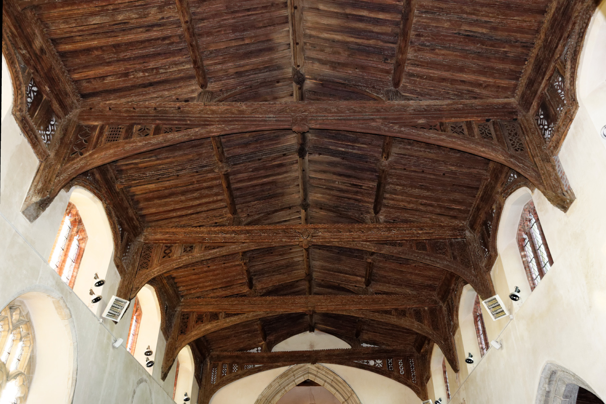 This extraordinary 16th century flat-pitched queen post roof is divided into four bays and contains numerous bosses carved with human faces, animals, foliage and so on. The tie beams are carved with running foliage. Here and there, the carvings are unfinished.