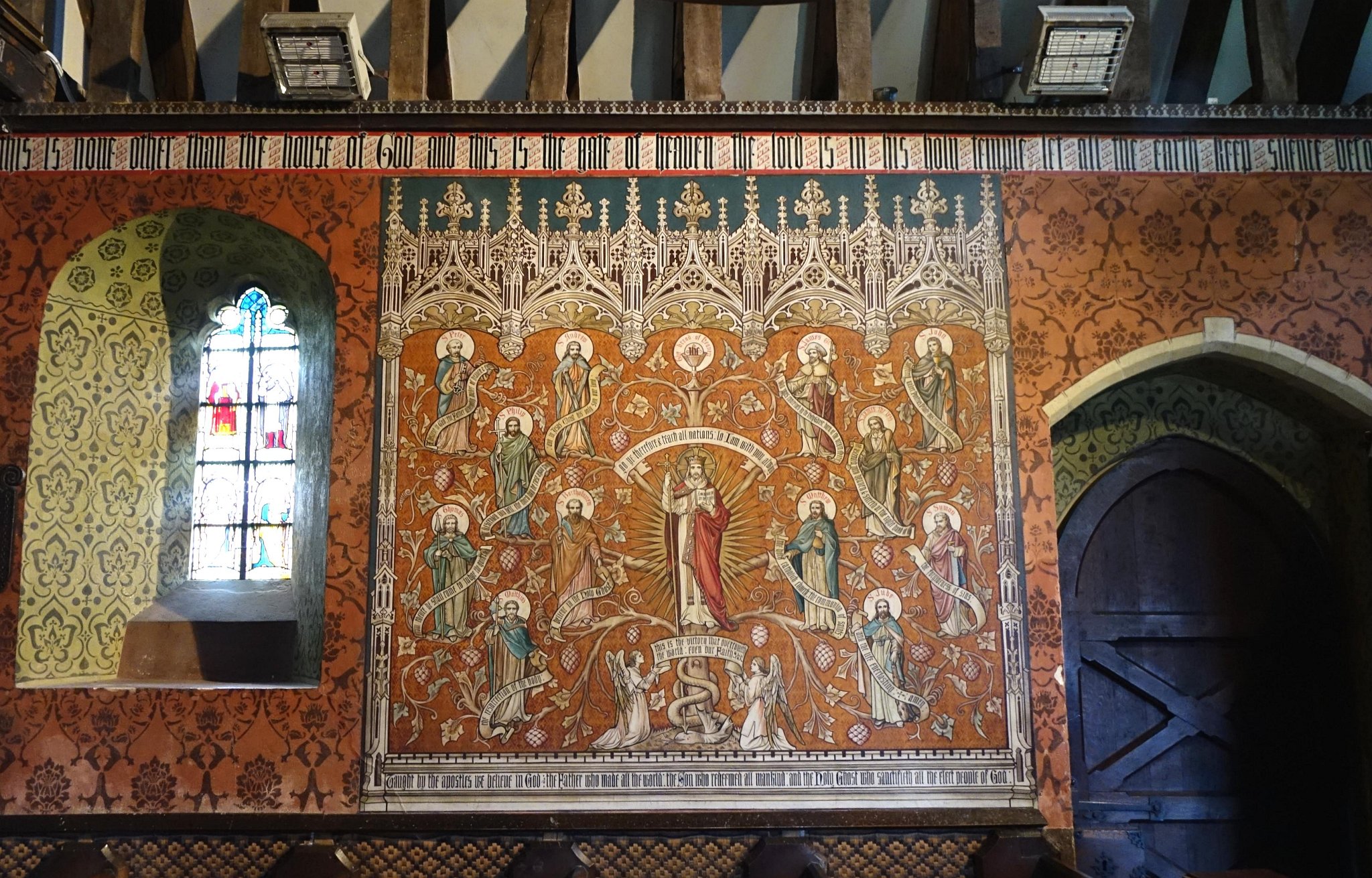 This painting shows Christ and the apostles standing in a vine-like tree. The banners contain the words of the Apostle's Creed. At the base of the tree is a coiled winged serpent. Christ is depicted holding a book and a cross - and the base of the cross is an arrow, piercing the serpent's head.
