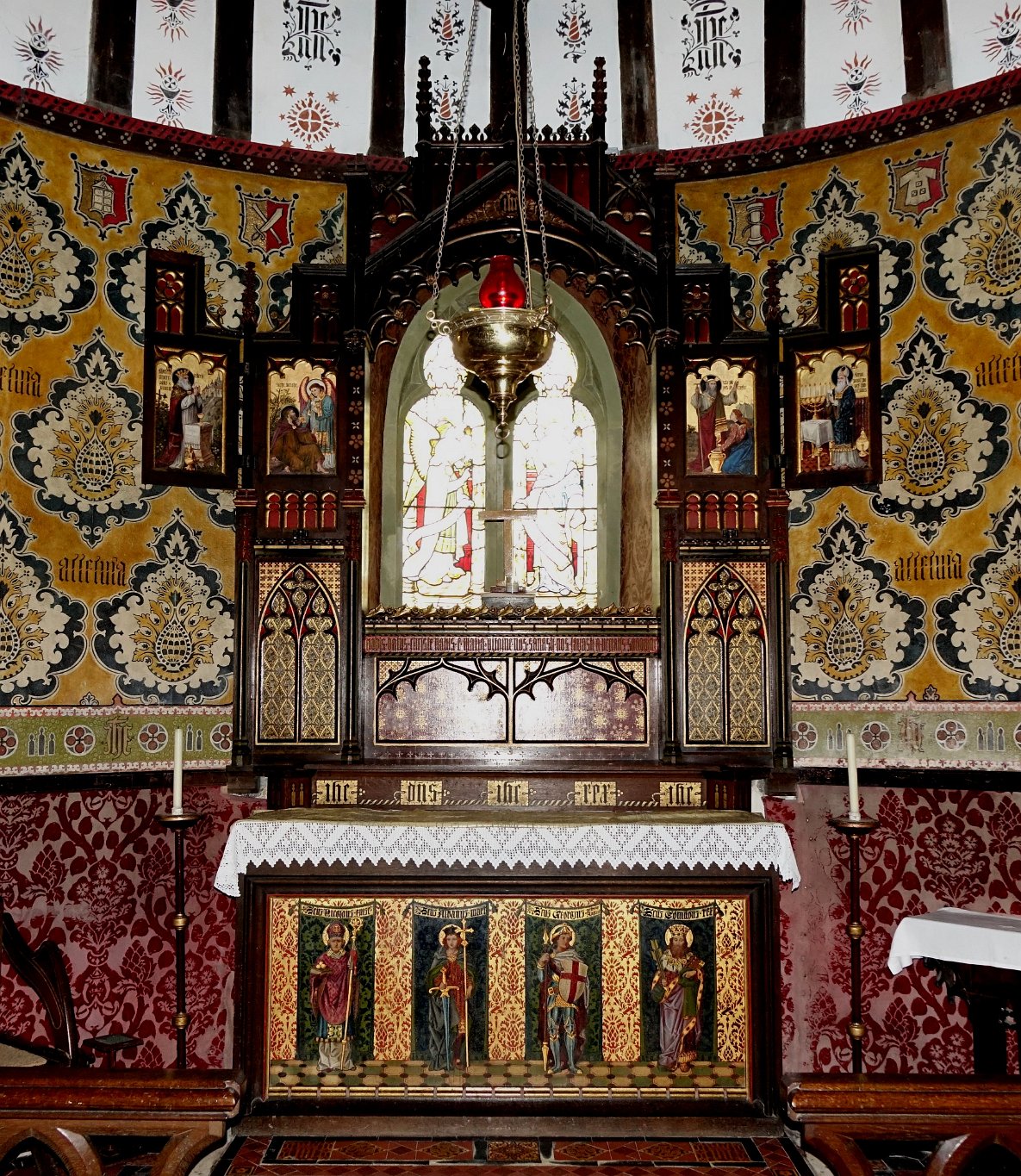 The altar and reredos, added by Rev Geldart in 1884, frame the east window.