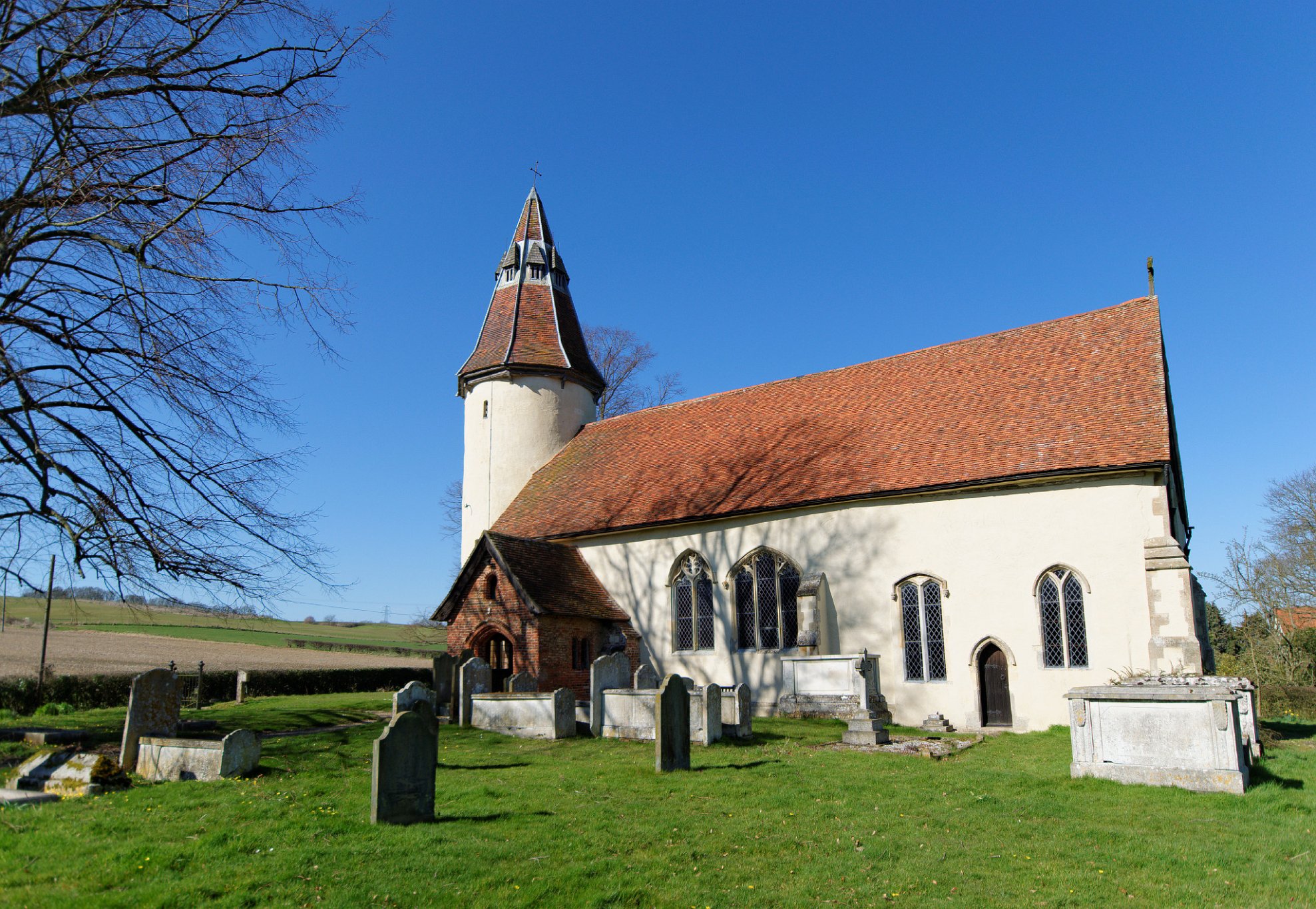 Not every Lord of the Manor (in this case Simon de Beaumont) can afford to build a castle, but a church with a round tower provided both a defensible structure (with slit windows) and a statement of piety. The church was built c.1140 and is one of only 6 churches with round towers in Essex. The tower was badly damaged by a lightning strike in 1767 and repaired with brick, timber and plaster - all neatly hidden by the rendering. The octagonal church spire with 'fairy-tale' dormer windows is an addition by Blomfield during restoration in 1865-9. Grade I listed.