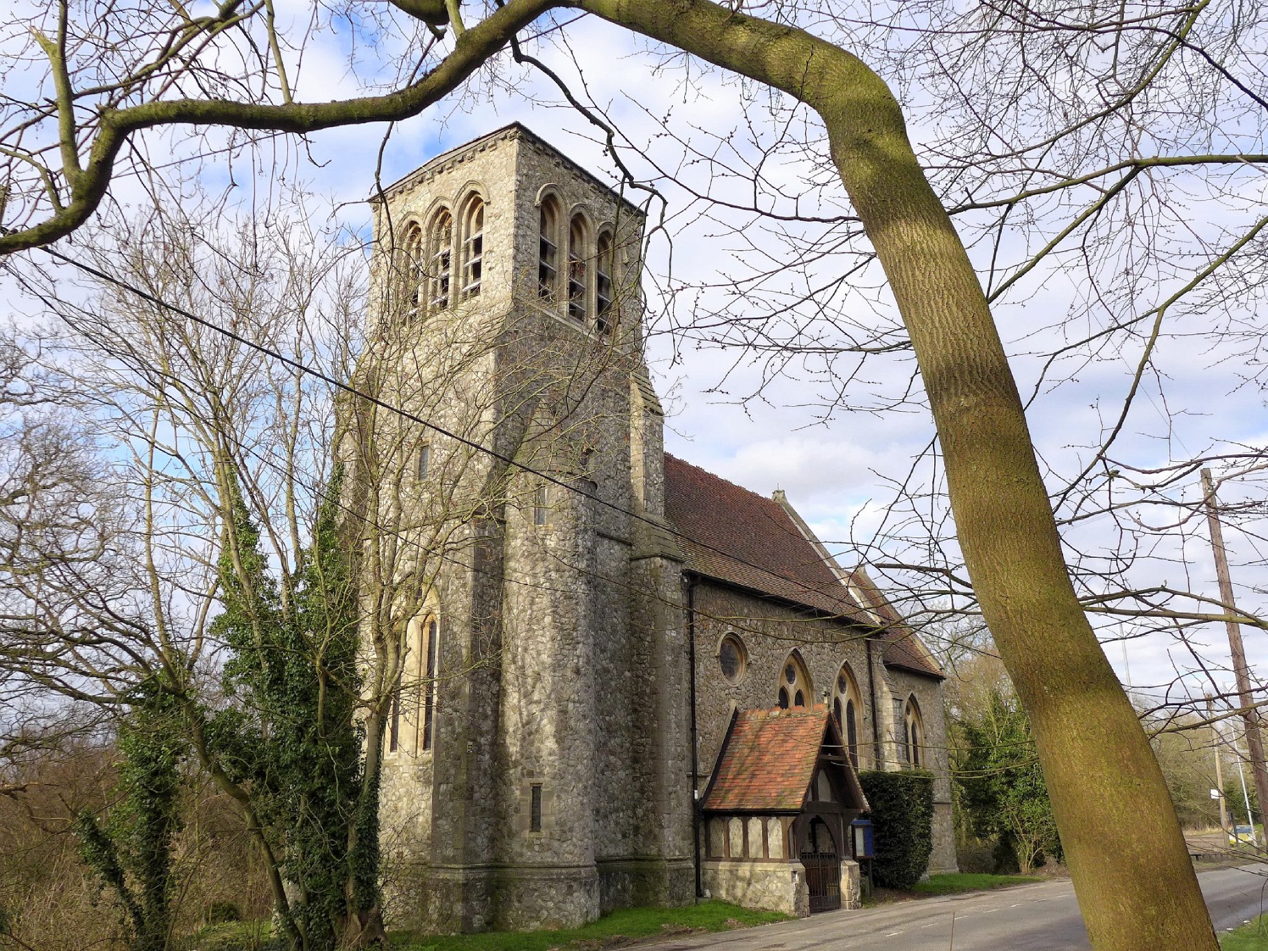 The church was built in 1876 on a man-made mound on the highest point of Hall Wood, to replace the older St Mary and All Saints at Old Church Hill. It is made of brick with a facing of ragstone in the Early English style.