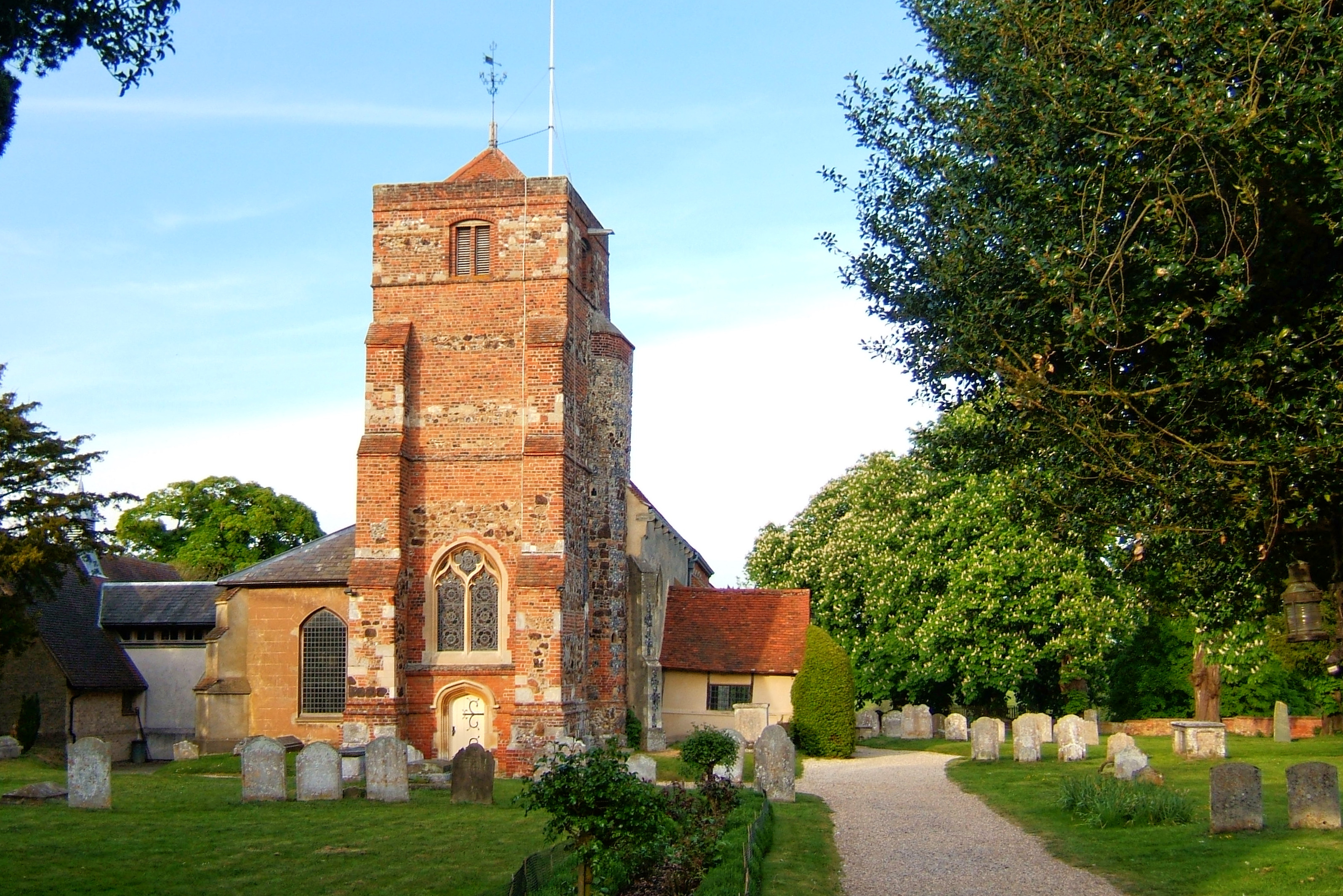 The chancel of Lawford Church was built in the fourteenth century. It contains 8 stone-framed windows which provided a degree of internal light which was quite unusual at the time.The north east window is interesting in that it depicts people and humour, with portrayals of revellers dancing, wrestling, playing instruments and holding each other by the leg.