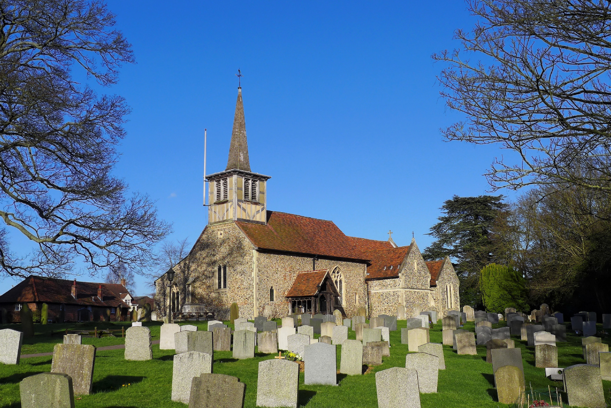 The nave and part of the chancel are Norman, although the chancel was lengthened in the 13th century. The porch is 14th century and shelters a Norman doorway built of Roman bricks. The 15th century single hammerbeam chancel roof is noteworthy. The half timbered bell tower and shingled spire were added during the 17th century. One of the church bells dates from c.1330 (which must make it one of the oldest church bells in the county), the others from c.1400 and 1683. In 1901 the church was struck by lightening, damaging the bell turret and the nave roof.