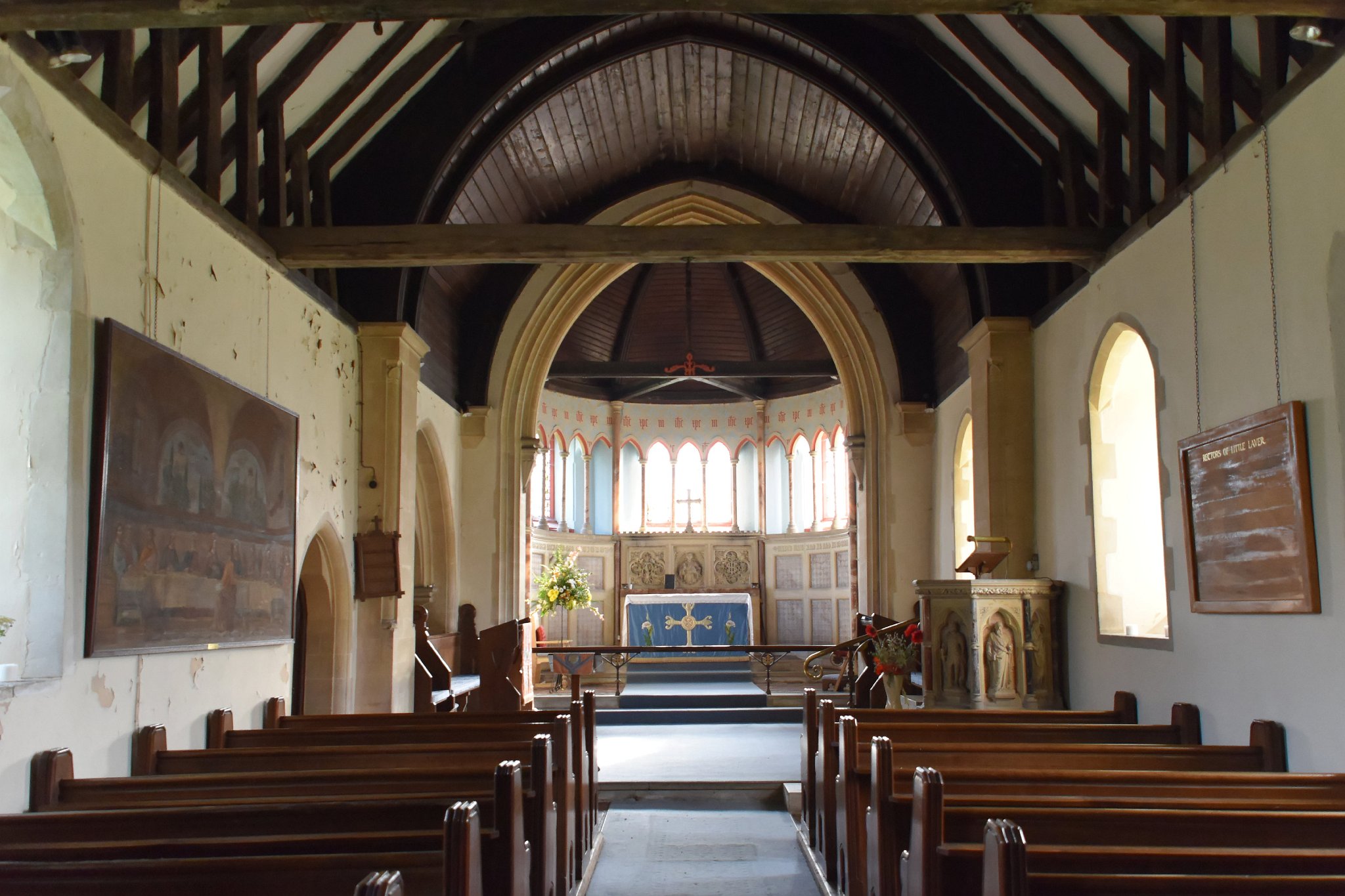 The 14th century church was heavily restored in 1872. The apse contains three windows with a slender arcade of alabaster columns to each window.