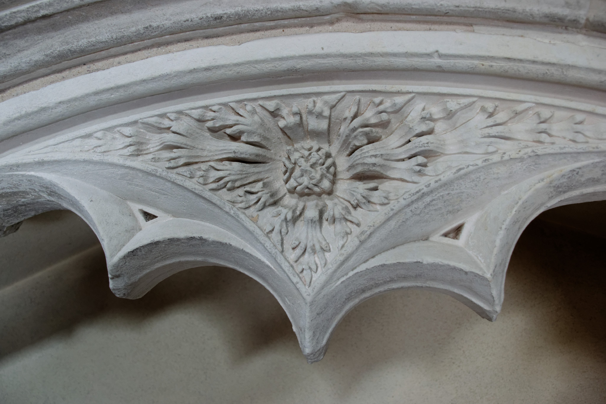 This beautifully carved spandrel shows the Sun, with spreading flames, which is representative of God in many religions, especially early Celtic Christianity. For example, many early Christian symbols which contain IHS within the symbol of a flaming sun. The church is orientated to the east - where the rising sun is symbolic of Christ's return.