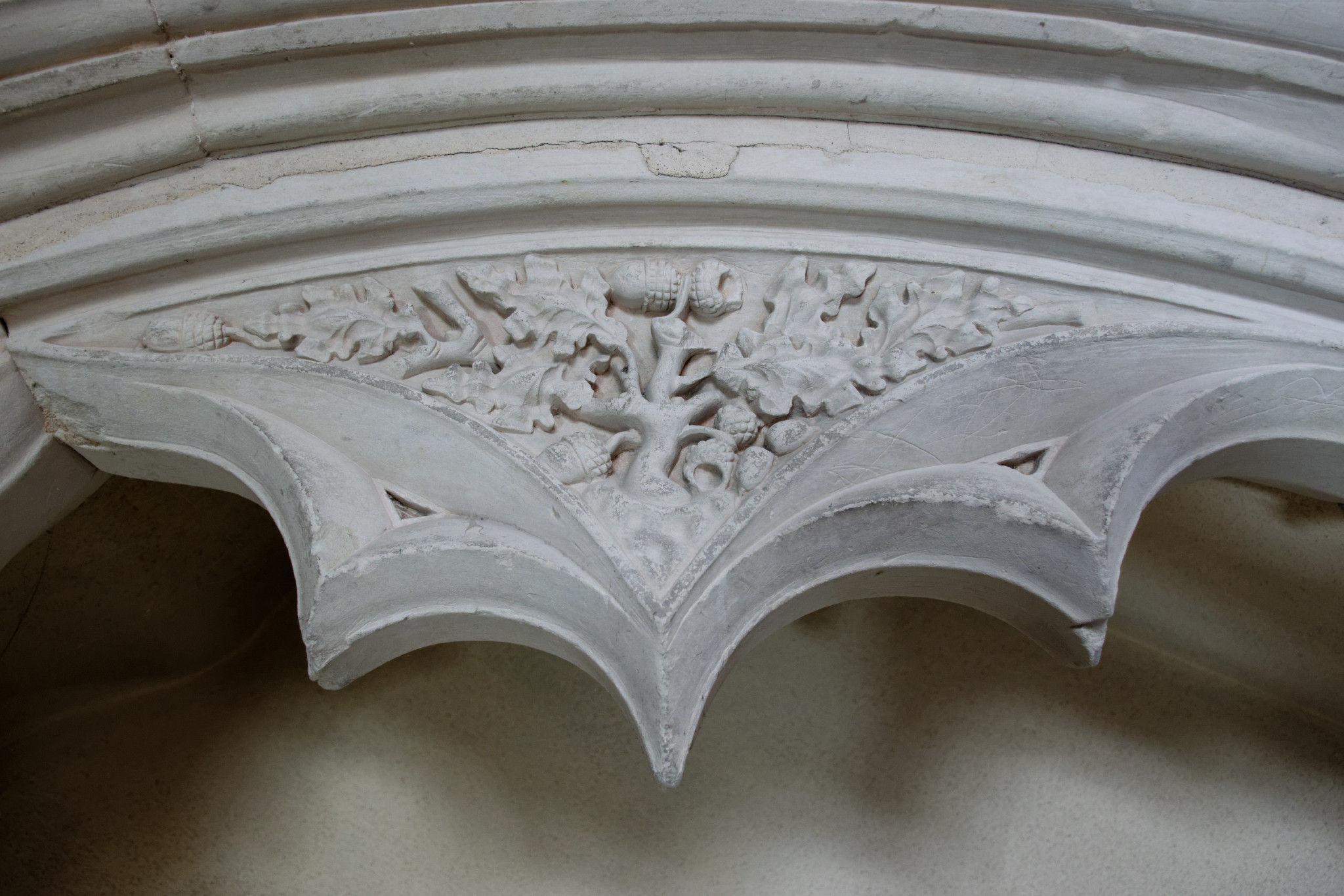 This beautiful 14th century carving shows an oak tree. The Oak is also a time-honoured pagan symbol of a pantheistic belief in a spirit which lies within all life on earth. Oak groves were considered sacred places, and many place names such as "Holy Oak" have sprung up in a merging of old pagan and new Christian beliefs. Lying opposite the symbol of the Sun - or Yahweh, I would suggest the Oak Tree carving is seen as the counter-balancing pagan interpretation of an everlasting divine entity.