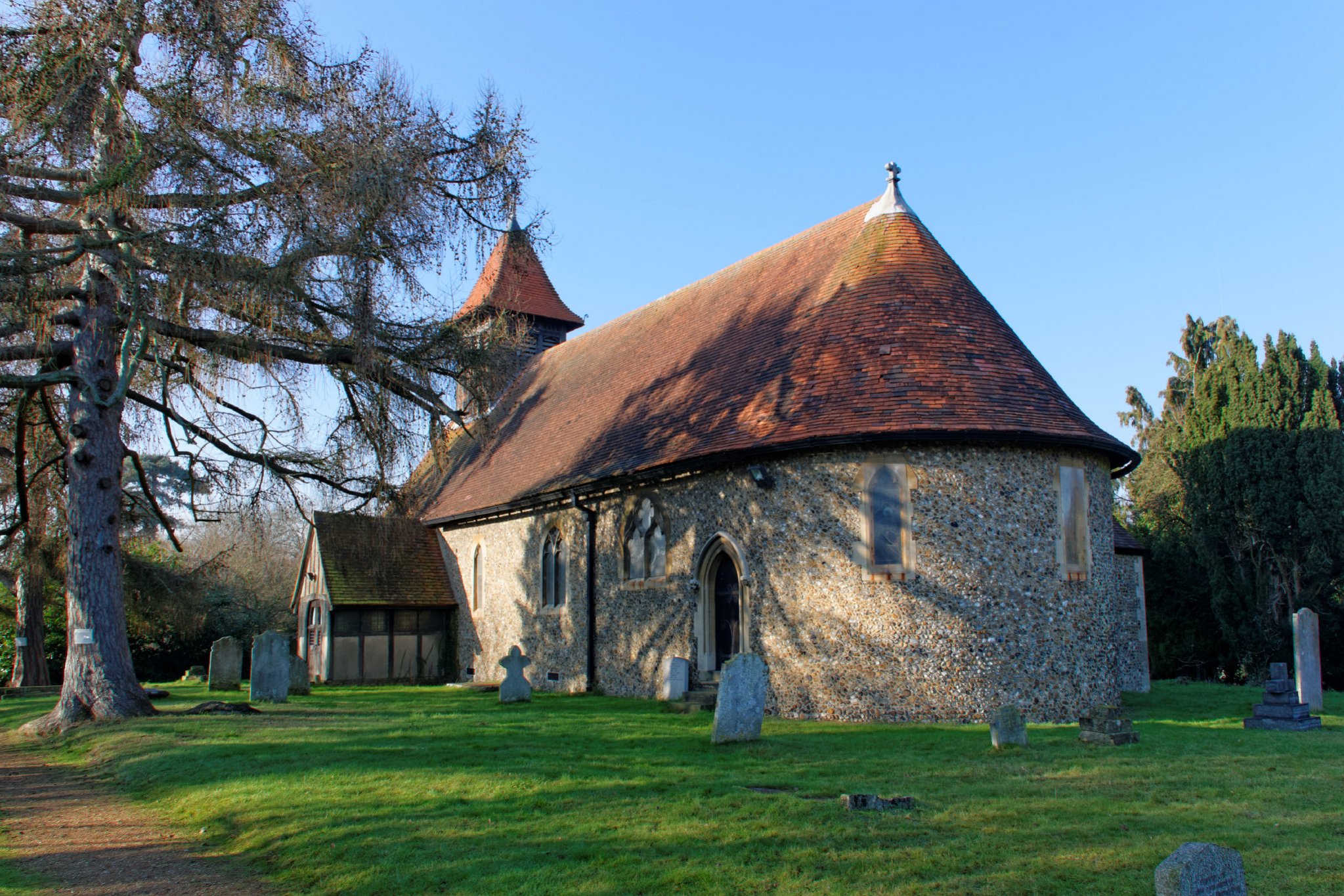 Victorian flint church with apsidal chancel and picturesque belfry with brick nogging between the studwork.
