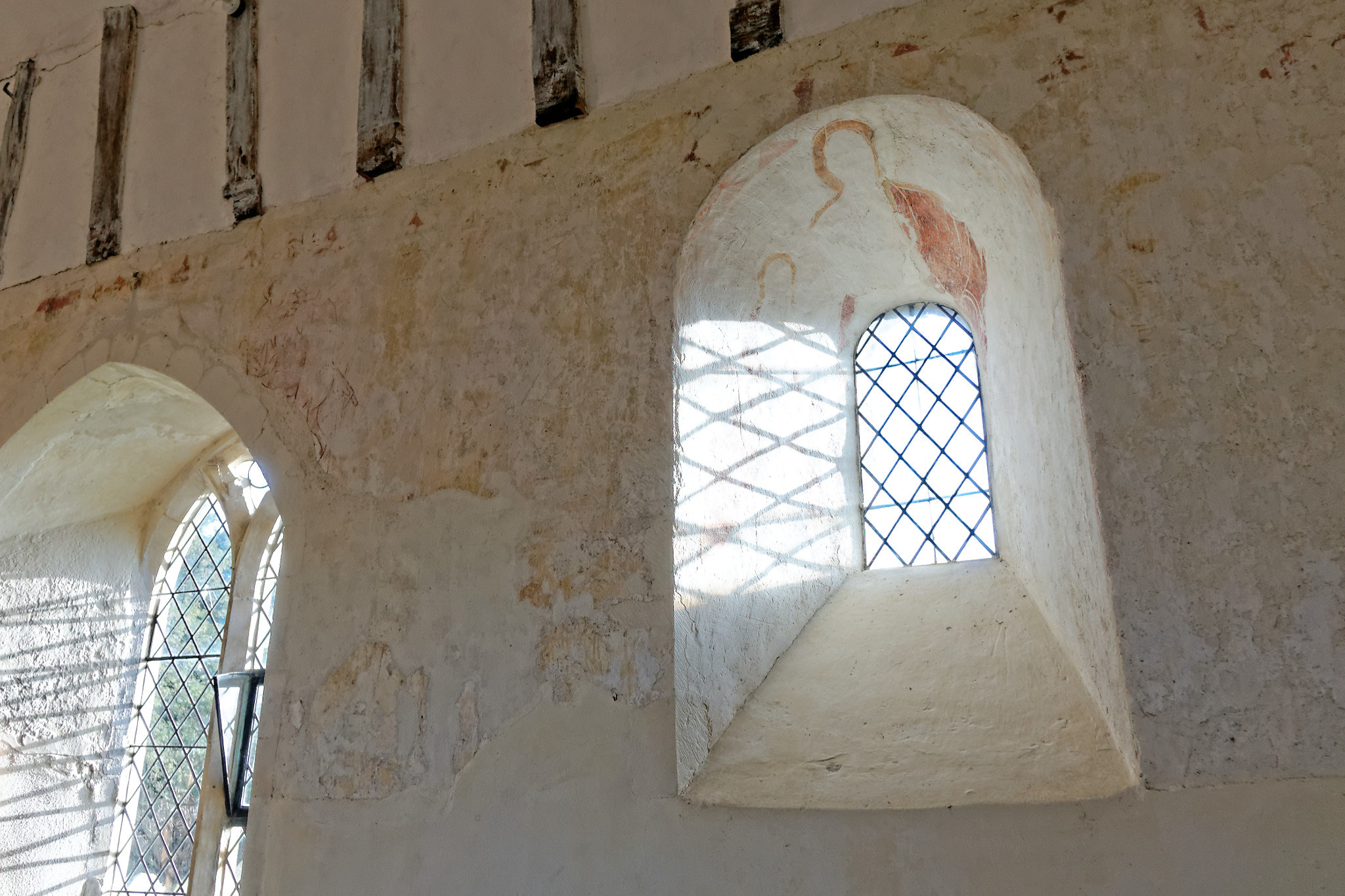 The figure in the window soffit has blond hair and wears a white undershirt, with a red cloak over his shoulder. A similar, smaller figure apears on the eastern splay. These figures are possibly representations of saints or martyrs, and it is likely that all of the 12th century windows would have had similar decorations.