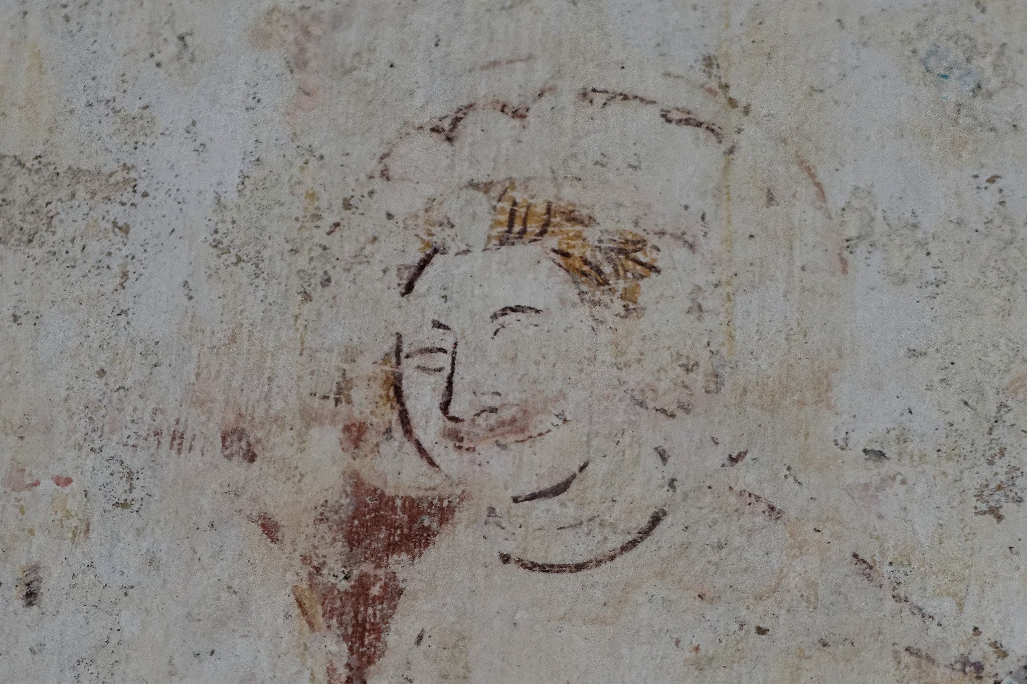 The Christ Child, sitting on the shoulder of St Christopher, painted in the 14th century. This painting is on the north wall of the church.