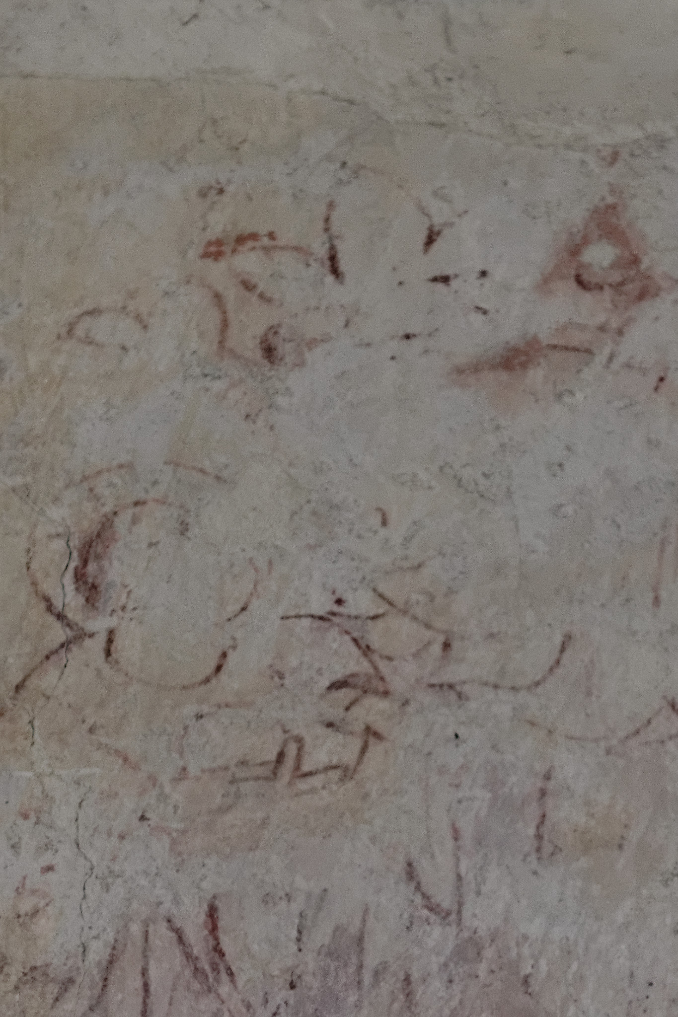 Madonna and Child. This painting on the south wall of the church dates from the 14th century. It is a very fine and tender depiction of the Virgin and Child, with the Child, who is holding a orb, sitting on the hip of the crowned Virgin.