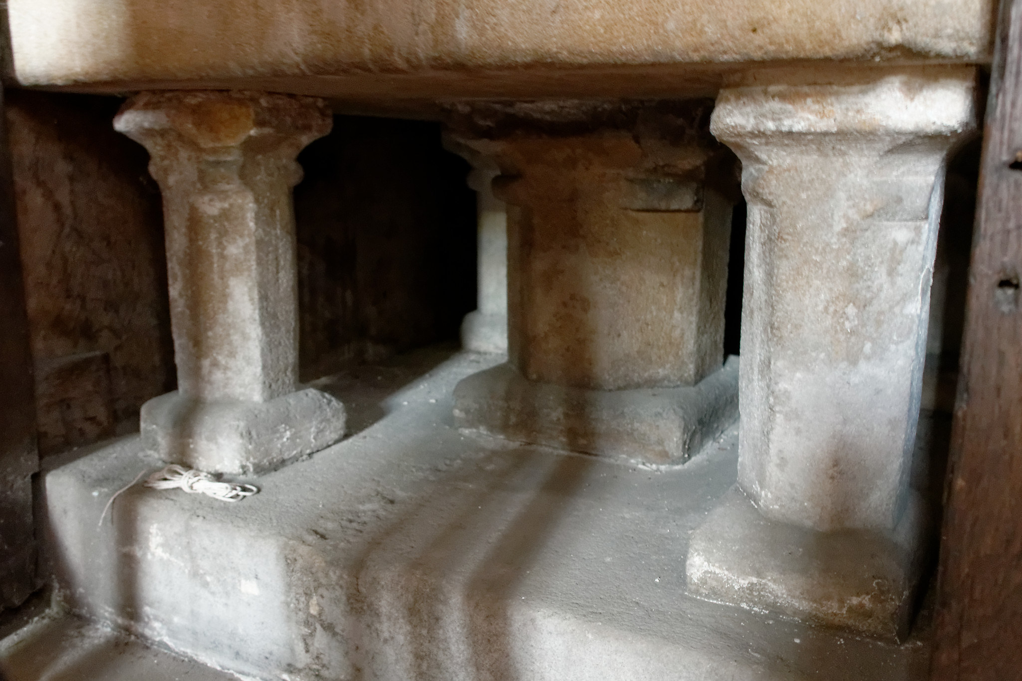 Inside the elaborate wooden casing lies a simple, square stone font dating from the thirteenth century. And a piece of string.