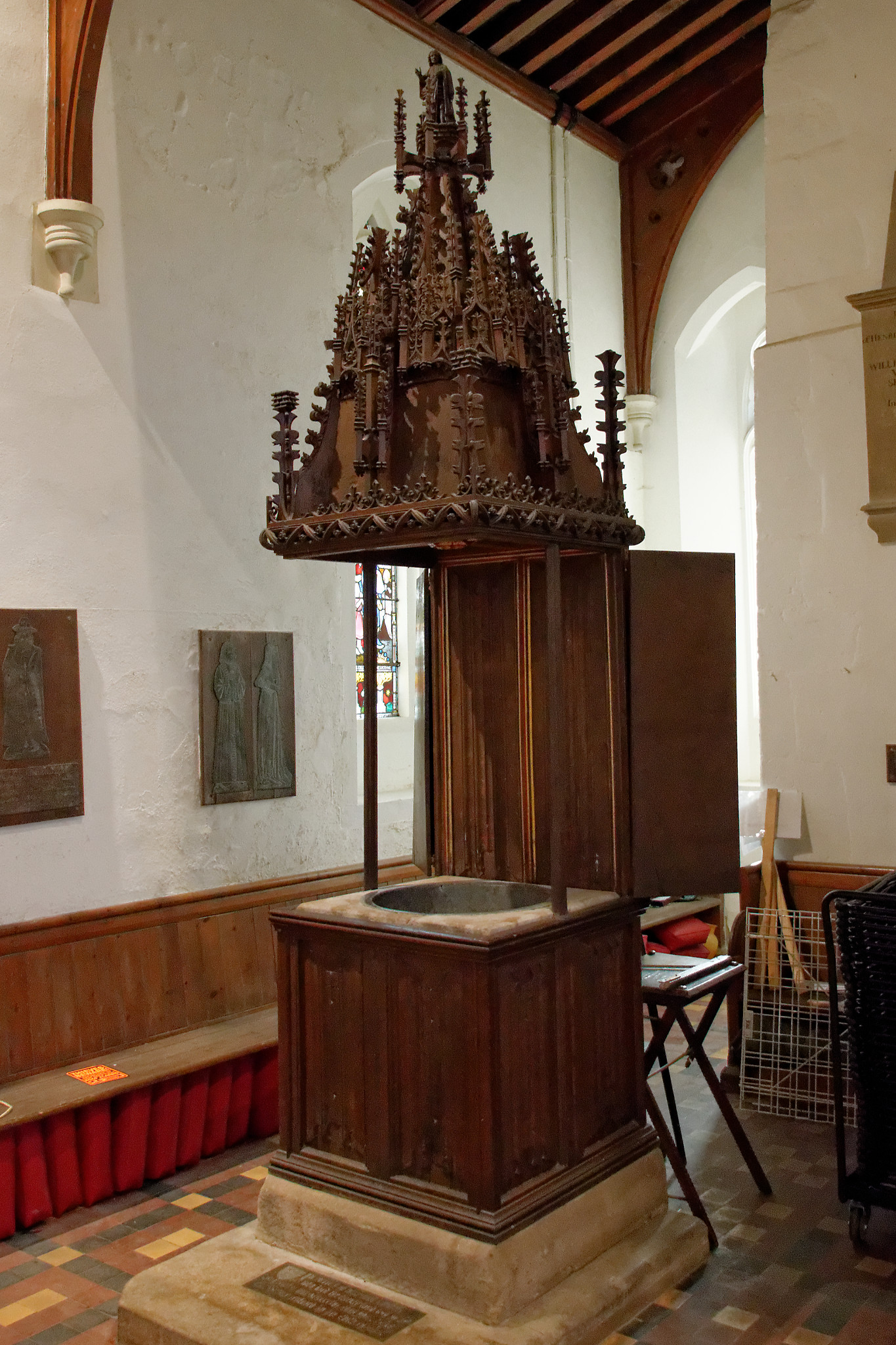 Inside this grand church almost nothing remains of its medieval past, except the plain, square, thirteenth century font. Even this has been encased in an elaborate early 16th century wooden case with linenfold panelling and a pyramidal canopy.