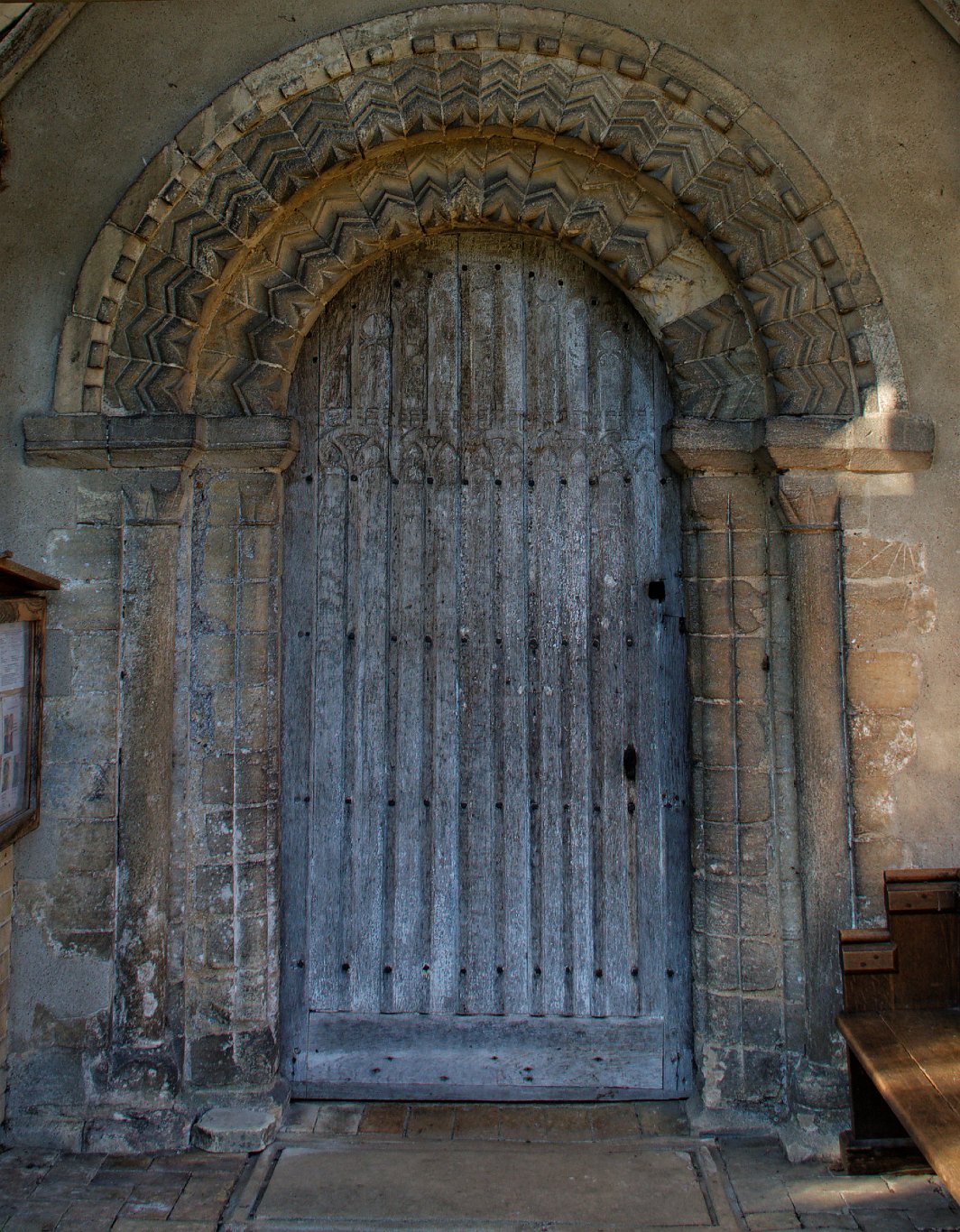 The south entrance is a fine example of a Norman arch with two orders of zig-zags crowning a medieval panelled door. On the right hand side of the east colonette framing the door there are some incribed lines radiating down from holes drilled into the stone. These are Mass Dials. In an age without clocks, and before the 16th century porch was built, a straw inserted into the hole would cast a shadow to tell whether or not they were in time for Mass.