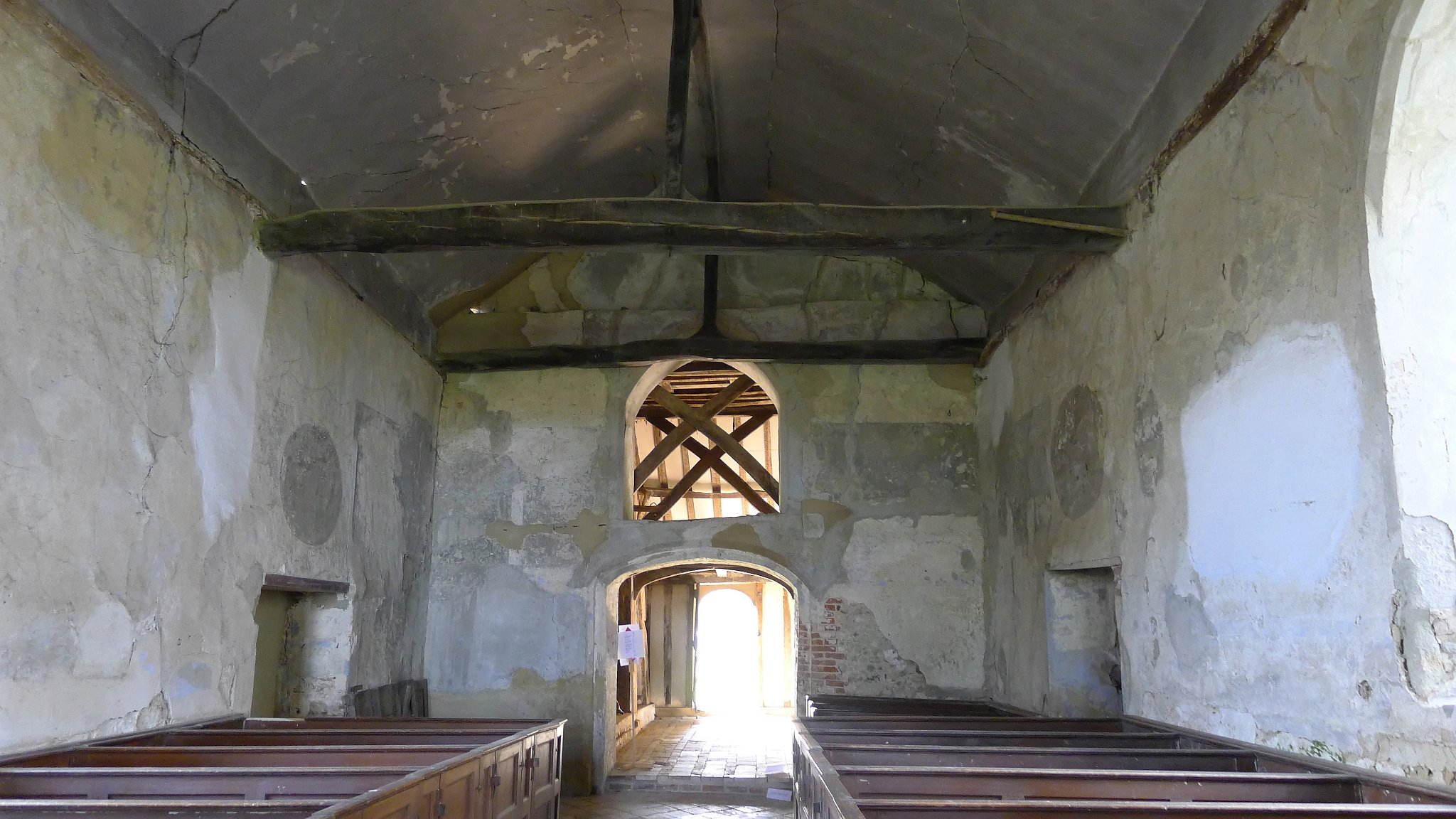 On the east wall is a nave mural showing tassels and bunched curtains being drawn aside from the window in a rare rural attempt at trompe l'oeil. The tower is unusual in having aisles to three sides.
