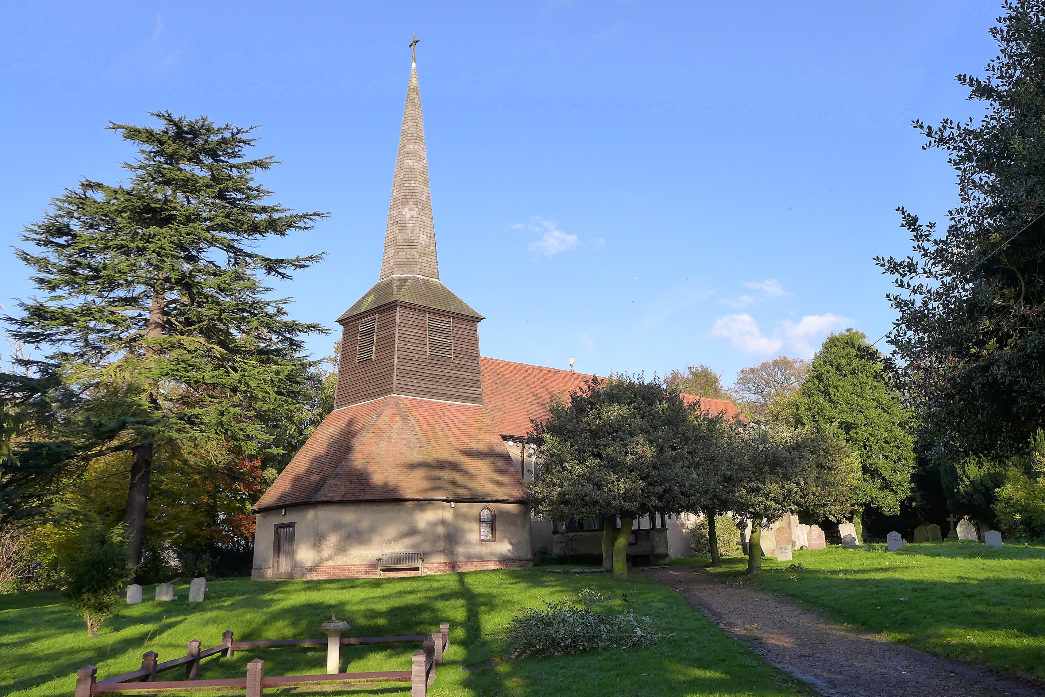 The church of St Thomas the Apostle consists of nave, chancel, south aisle, and western belfry with spire.The church dates from the 11th or 12th century but was largely rebuilt in the 13th and 14th centuries.The belfry was originally believed to have been added in the 15th century but radiocarbon tests and structural evidence show that it was built in the 13th century, probably c1250 or earlier. In 1940 the church was badly damaged by a German parachute mine.