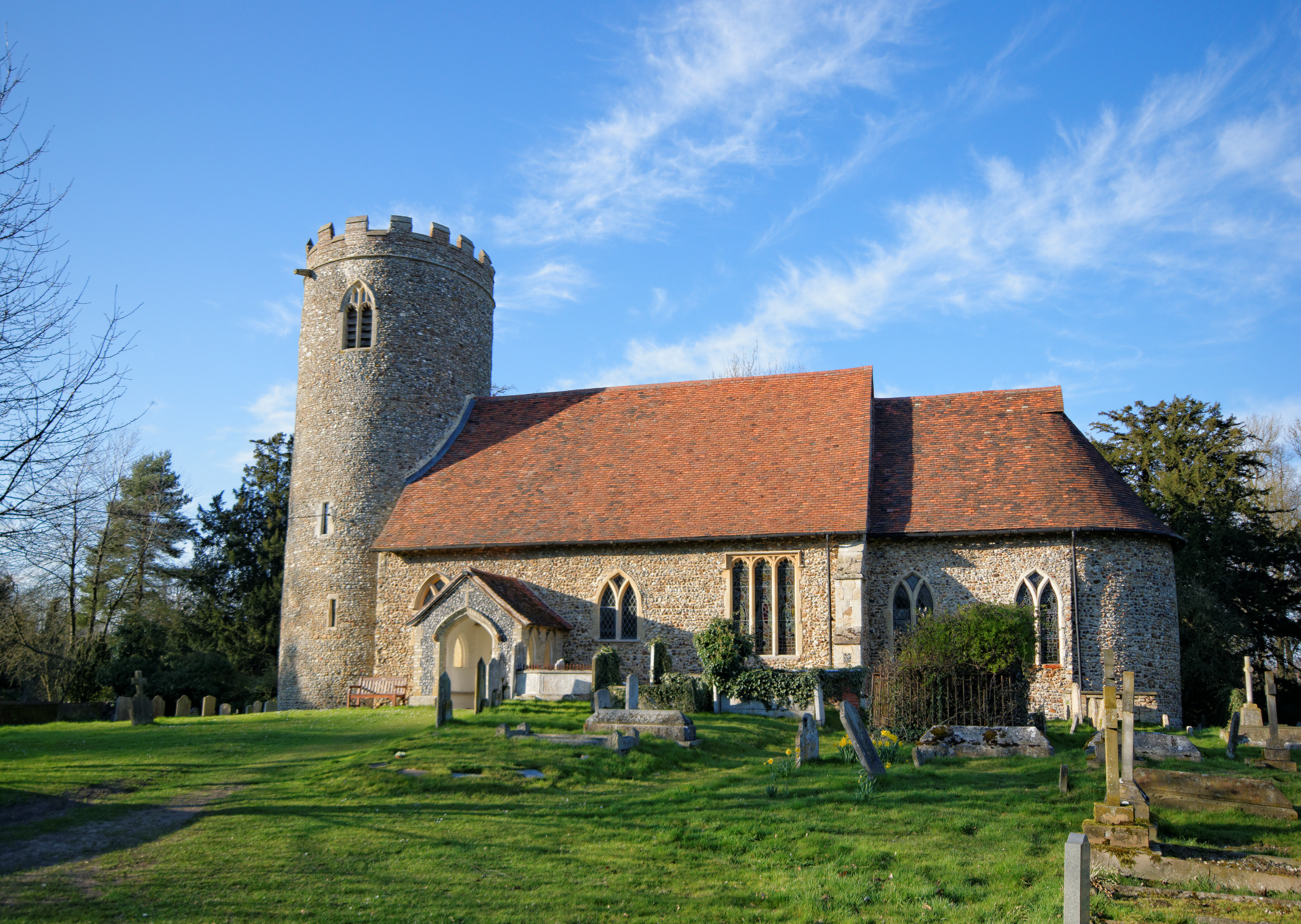 The nave and chancel are Norman. The apse is well preserved, with three windows. Pentlow church is one of six round towered churches in Essex. The main construction of the church is flint and pebble rubble with dressings of limestone and clunch. The tower (which has walls four feet thick) and north chapel date from the 14th century, although the north chapel was rebuilt in the 17th century. Inside the church a Norman west doorway survives: it would originally have been the main doorway into the church but today leads into the round tower.