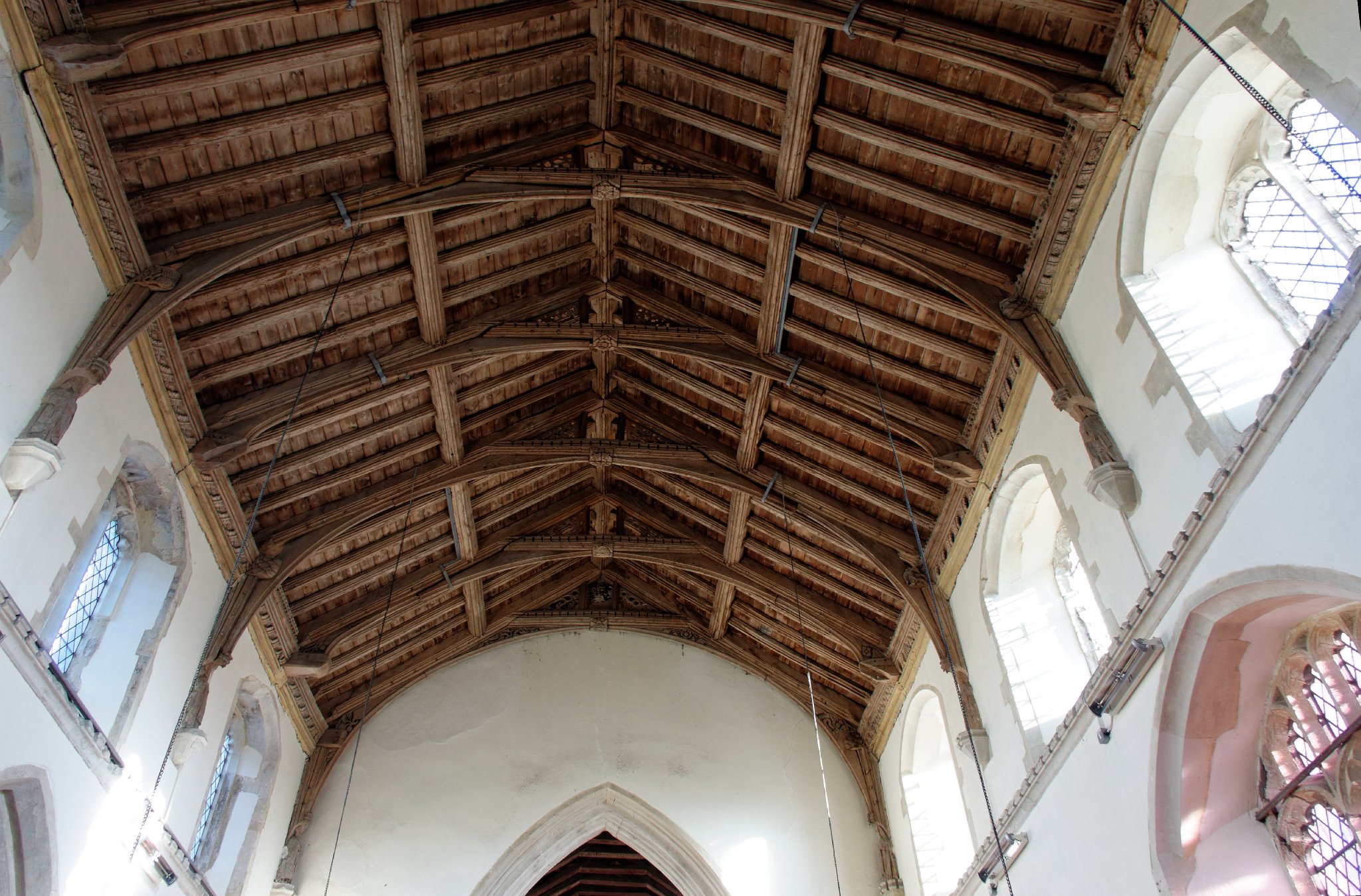 Above the 15th century clerestory windows, the splendid roof is supported by collar beams on arched braces, each alternate on resting on corbel supported shafts.