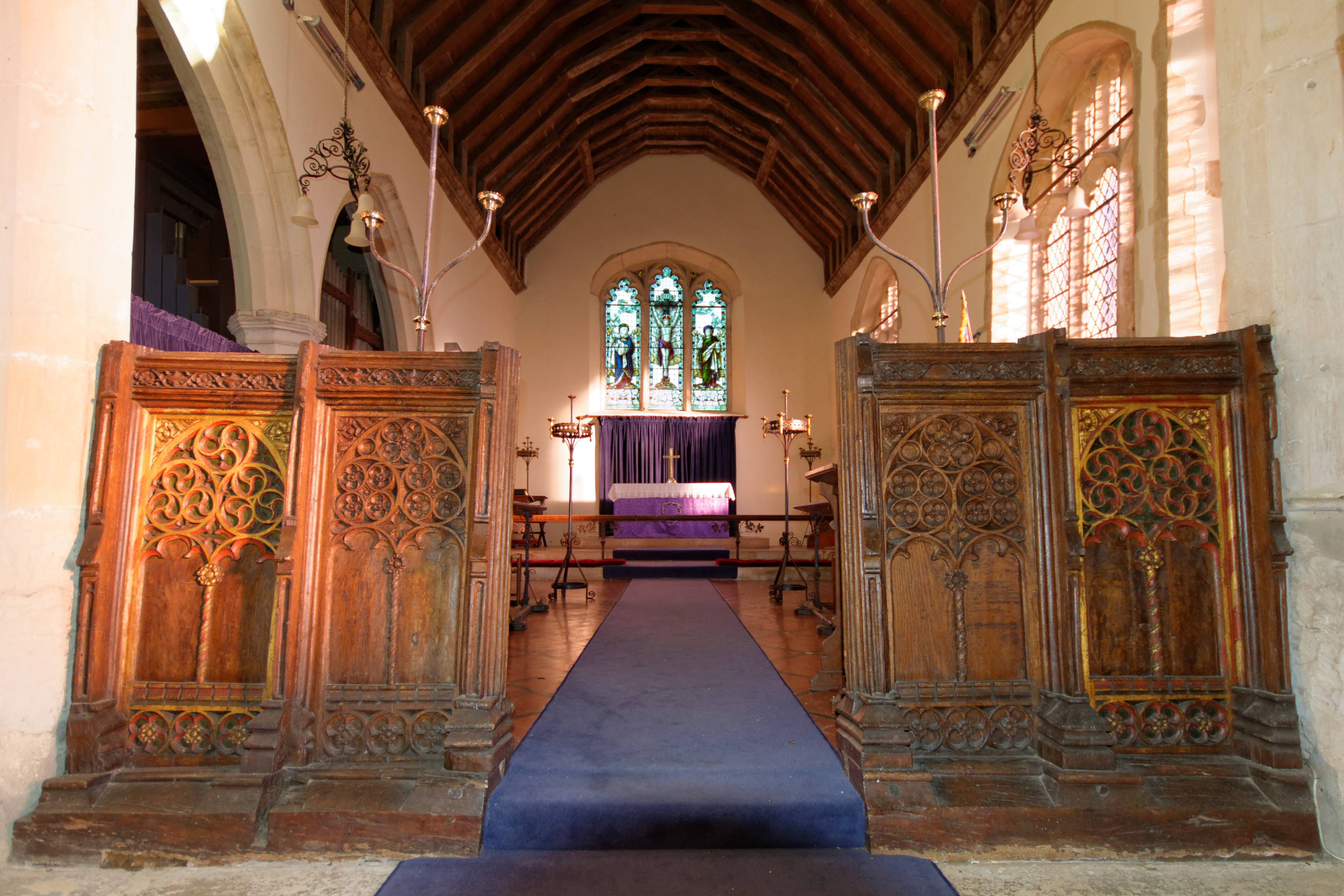 The 15th century screen under the chancel arch displays some wonderful workmanship. The outer panels have been highlighted in red and gold.