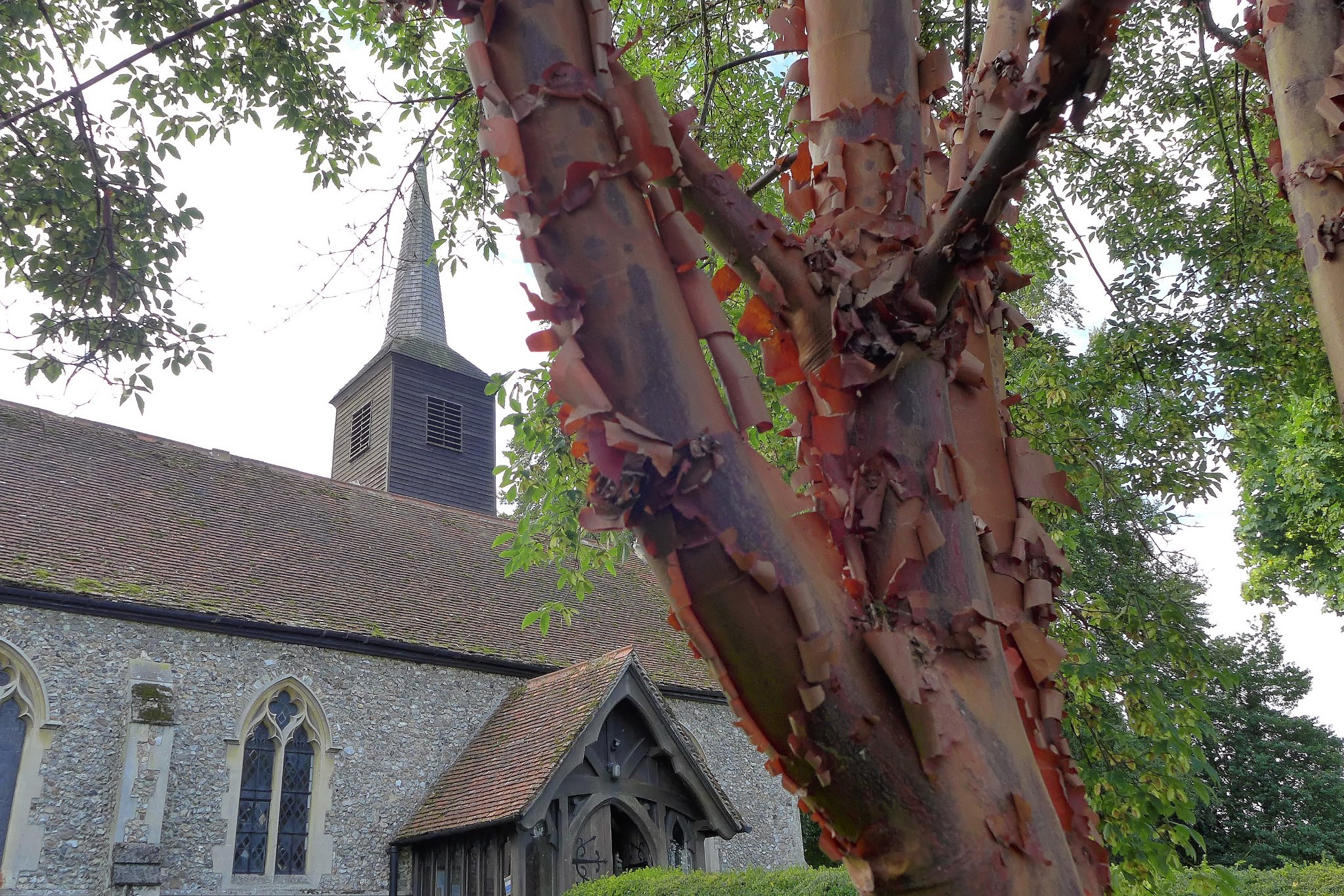 St Michaels in Roxwell, showing the nineteenth century porch and spire.