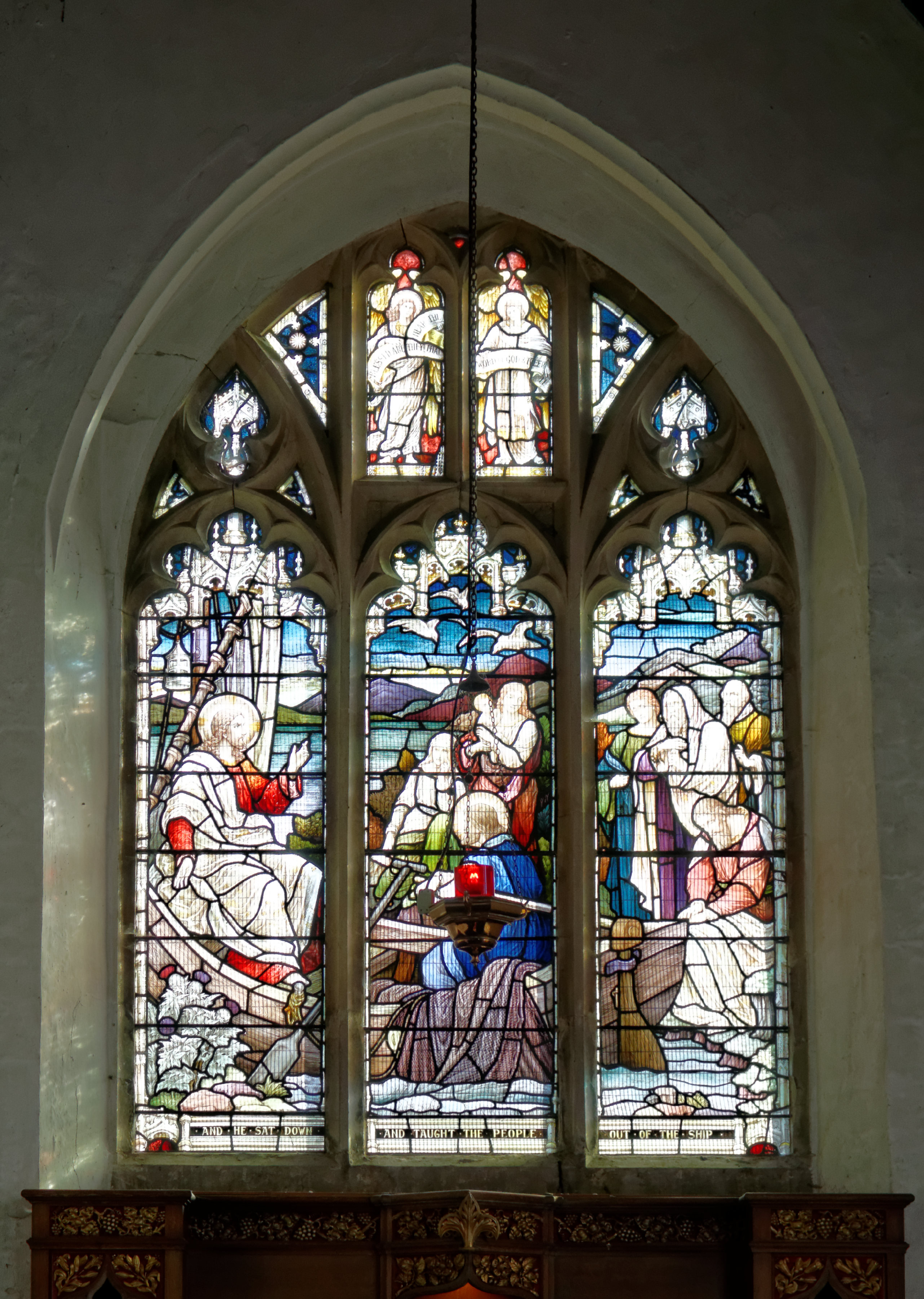 The stained glass in the east window is by Heaton, Butler and Bayne, 1920.