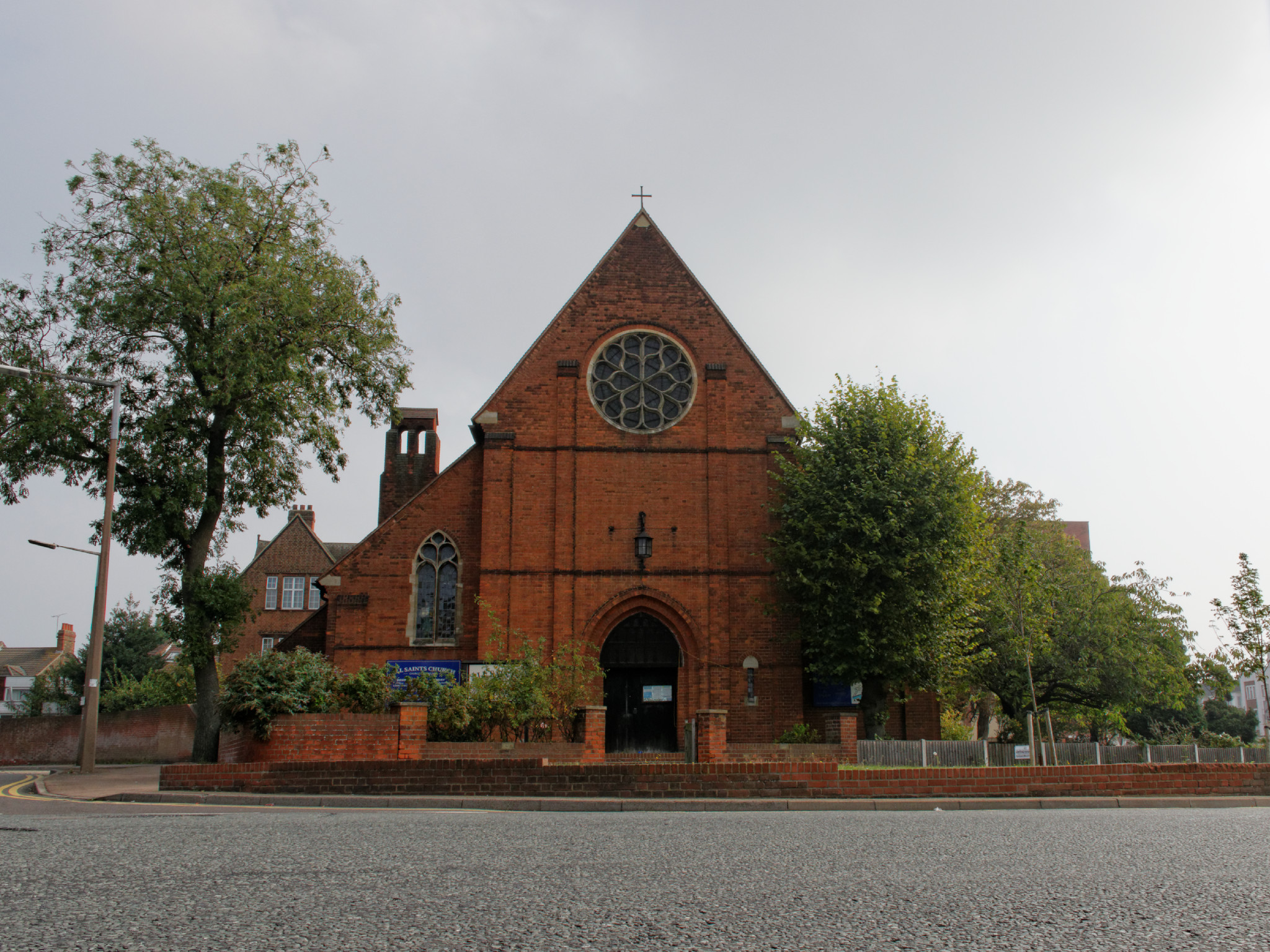 All Saints is a long towerless late Victorian red brick building, with a rose window at the west end. Originally, it was designed to have a massive brick tower with tiled steeple on the south-west corner. However, as frequently happened for new churches, this non-essential element was not carried out. The church overlooks a busy roundabout on the A13 in Southend.