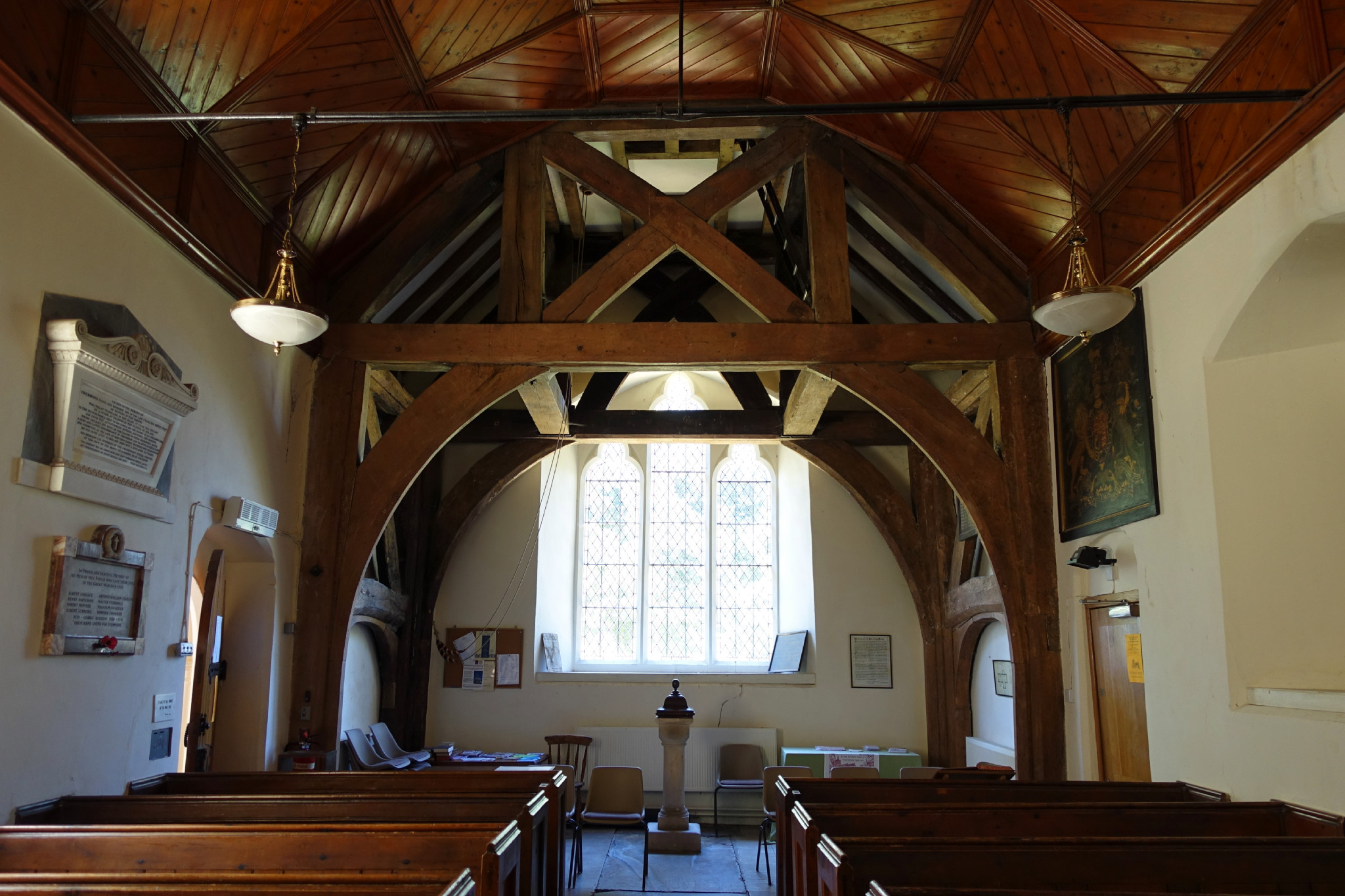 The ceiling of both nave and chancel were given pine panelling in the 1862 restoration, the chancel part being repainted in pale blue afer a fire in 1968.