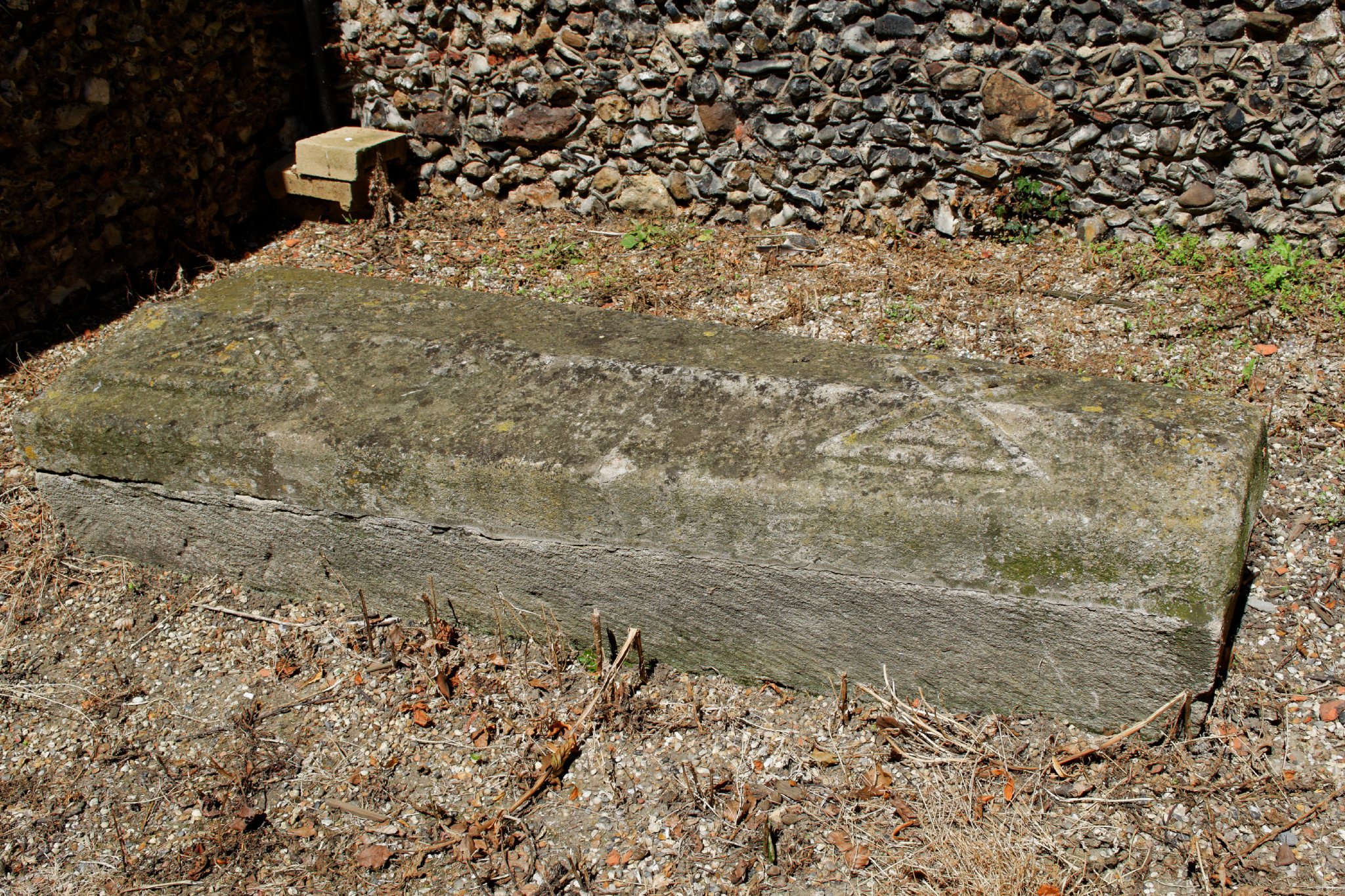 The gently coped stone lid has two carvings of a cross-like symbol, but they may also be symbols denoting the person's rank or profession.