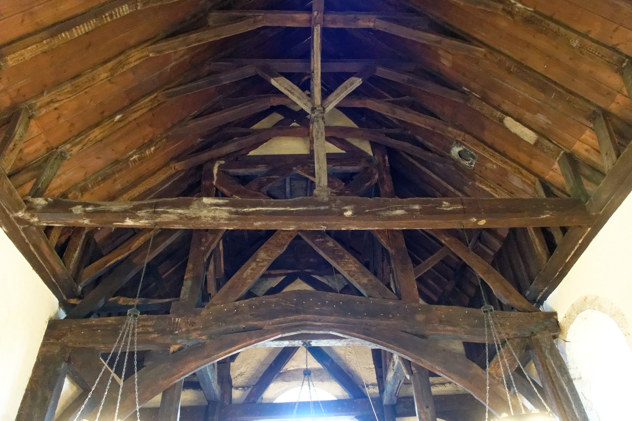 The nave looking west, showing the roof and and 4+4 post timber belfry structure. Posts along the north and south wall of the nave carry the weight via a curved brace, which provides additional support to the central four posts directly under the belfry.