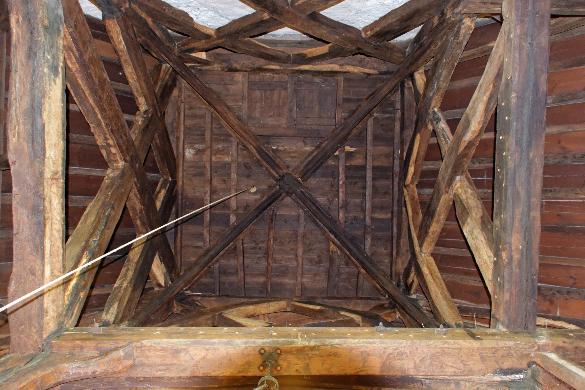 Looking up at the 14th century bell turret timbers. The four central posts are supported by trellis strutting.