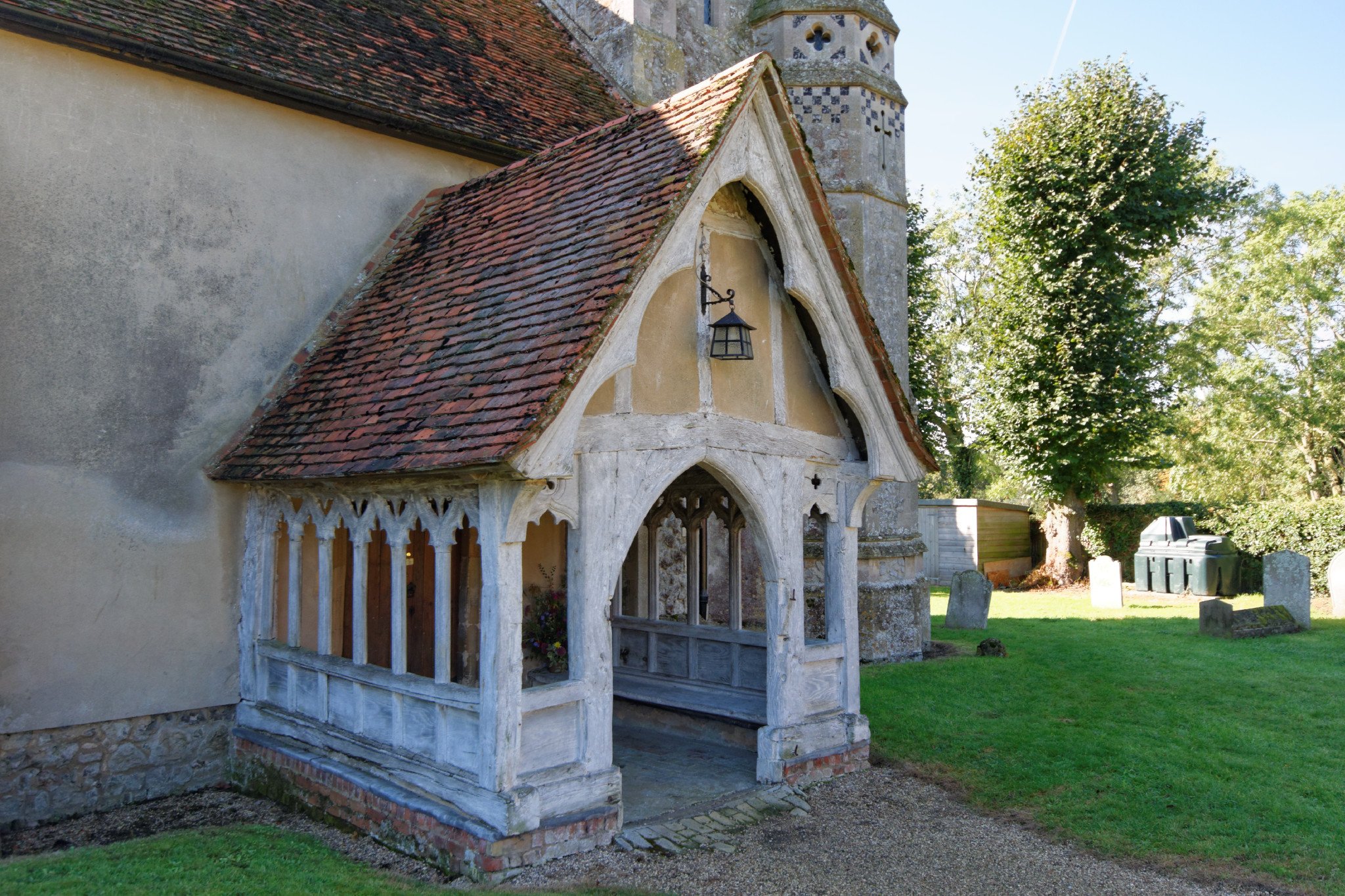 The wooden north porch is 14th century. The carved timber door-cases are a remarkable rarity, not seen anywhere else in the Archdeaconry.