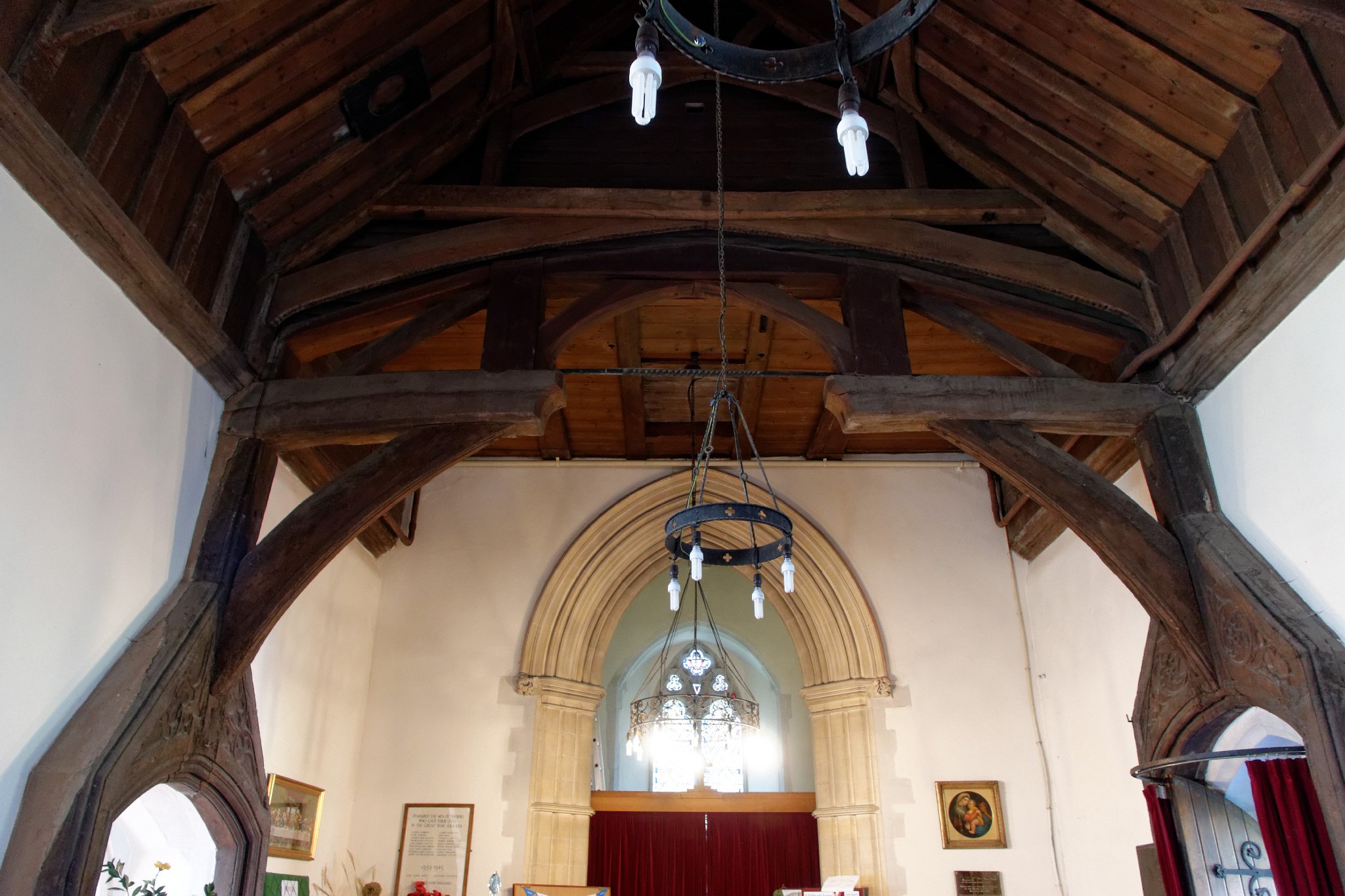 The unusual roof truss sits across the south and north doorways at the west end of the nave - the south door now leads into the south aisle. The ingenious 14th century carpenters used large timber frames for each door using the gable to support wall posts and braces of two hammerbeam supports, which in turn bear the weight of the roof.