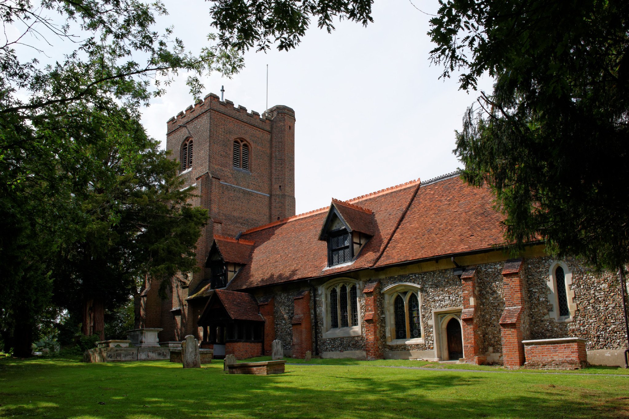 Parts of the nave date from the 13th century, included the scissor-braces of the roof, with additions in the 15th century. There is a north aisle in red brick built in 1644, and inside the arches and octagonal columns of the five-bay arcade are made of oak. With Epping Forest so close, timber was a cheaper and more readily accessible building material than stone. The Tudor tower was built c1520 in red brick with interspersed blue bricks. It is of three stages with an embattled parapet. The building id Grade I listed.