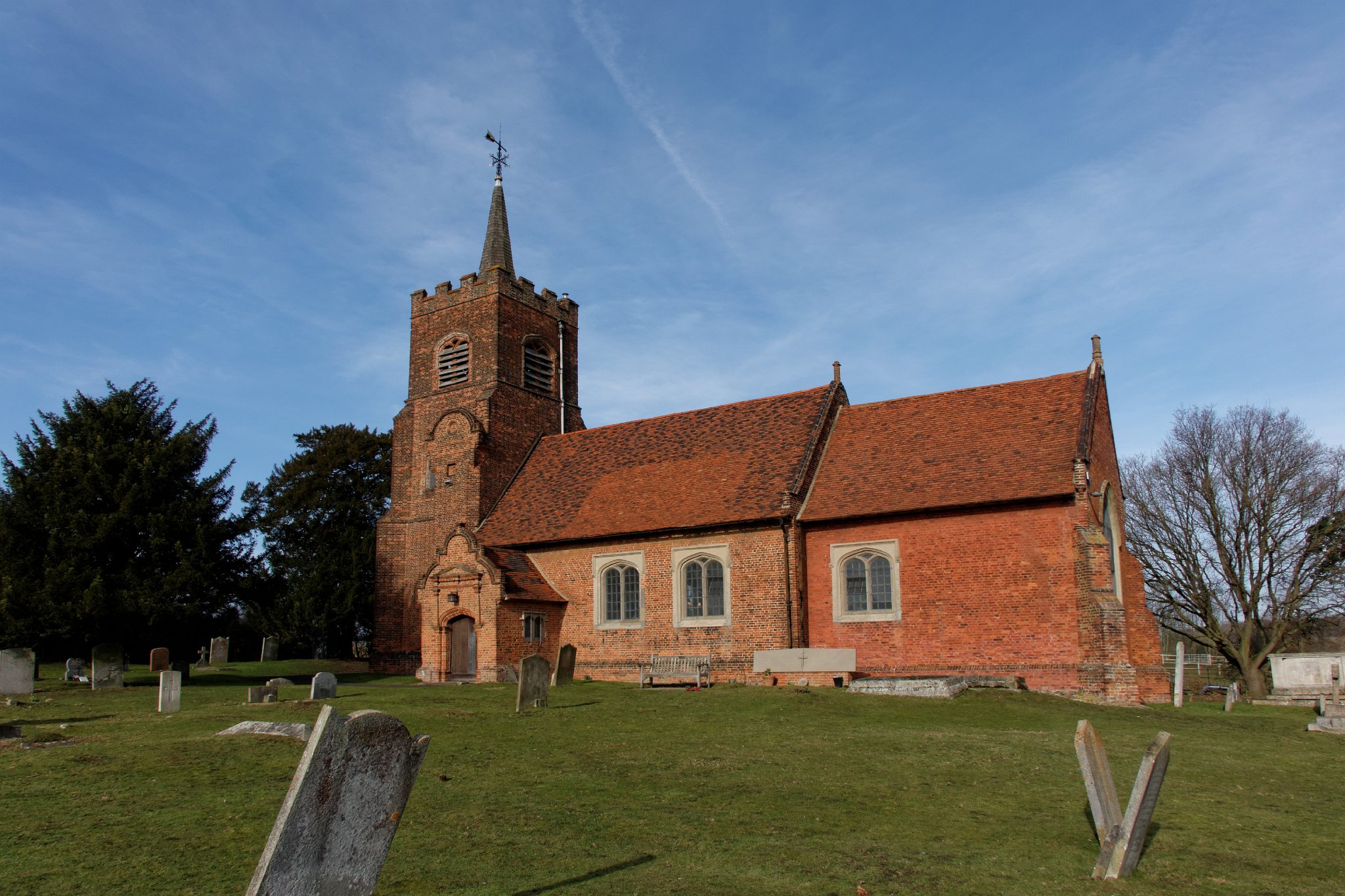 This church was built in 1614 after the previous medieval church burned down. Most of the cost of the new building was borne by the Smith family who lived at Hill House nearby, using bricks made in their own brickworks The chancel is clearly made from different materials. The church website states that this is because re-building the chancel was the responsibility of the Rector, who could only afford poor quality bricks. However Pevsner suggests that the chancel might be an additon made in 1577 (when Sir Thomas Smith was interred in a new vault beneath it) which survived the fire. The church contains numerous memorials to the Smith family. The building is Grade I listed.