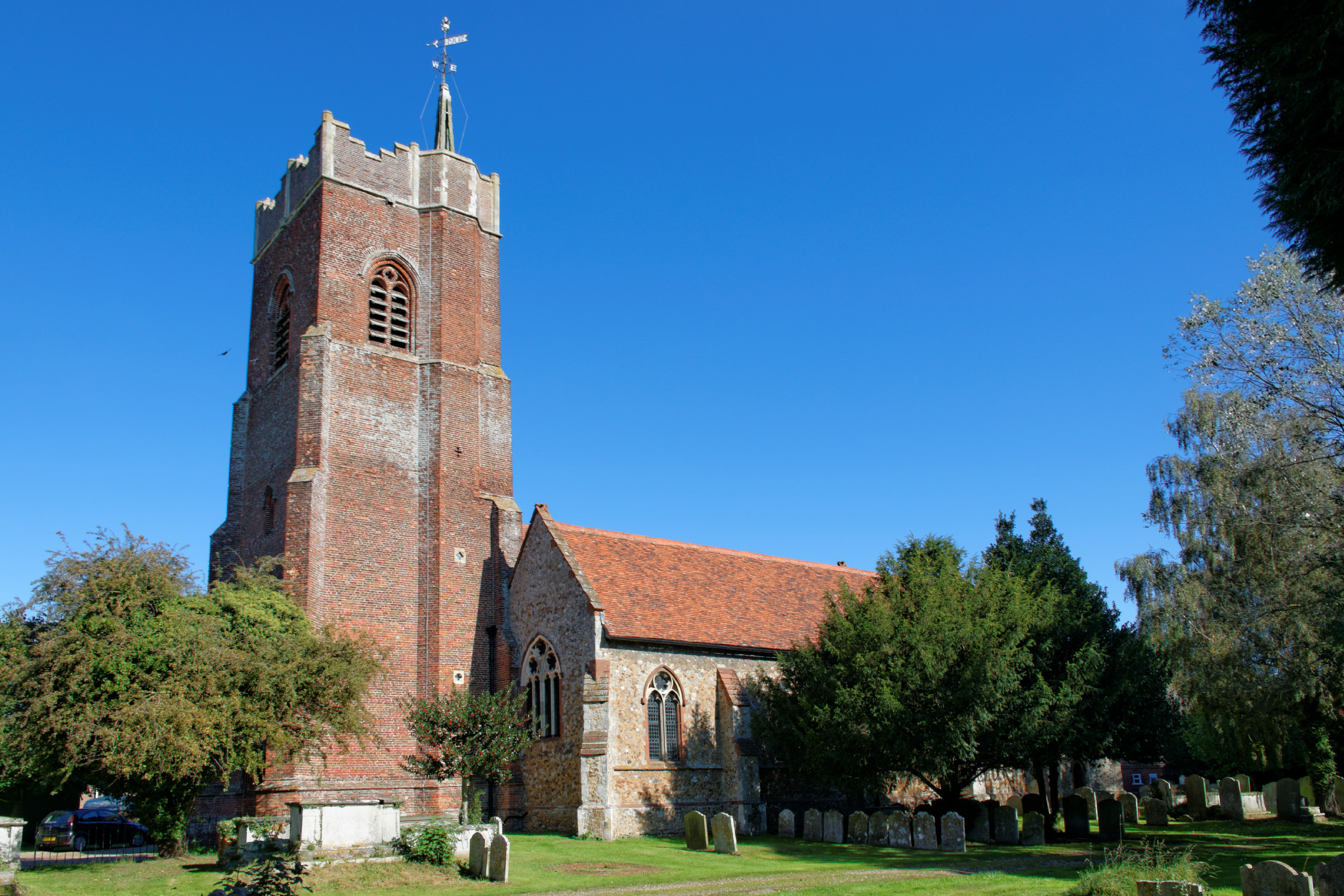 The chancel and nave were rebuilt in 1876. The Tudor tower in red brick with blue diapering and diagonal buttresses dominates the scene.
