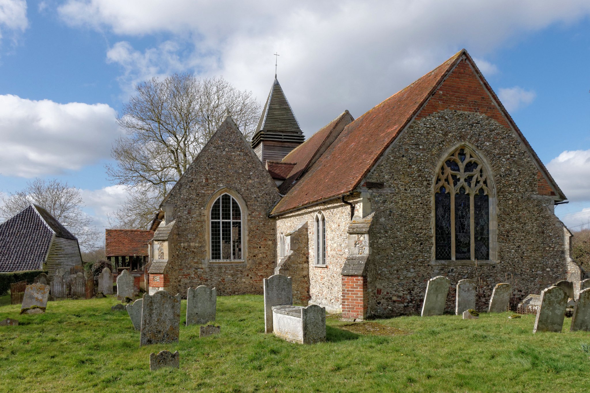 St Mary's church has a Saxon nave, fourteenth century chancel and south aisle, and 15th century bell tower. The nave once had a Norman south doorway but that was destroyed when the south aisle was added: pieces of carved stone from the doorway have been incorporated into the walls of the aisle (see note). The east window was replaced in 1928 in 14th century style.