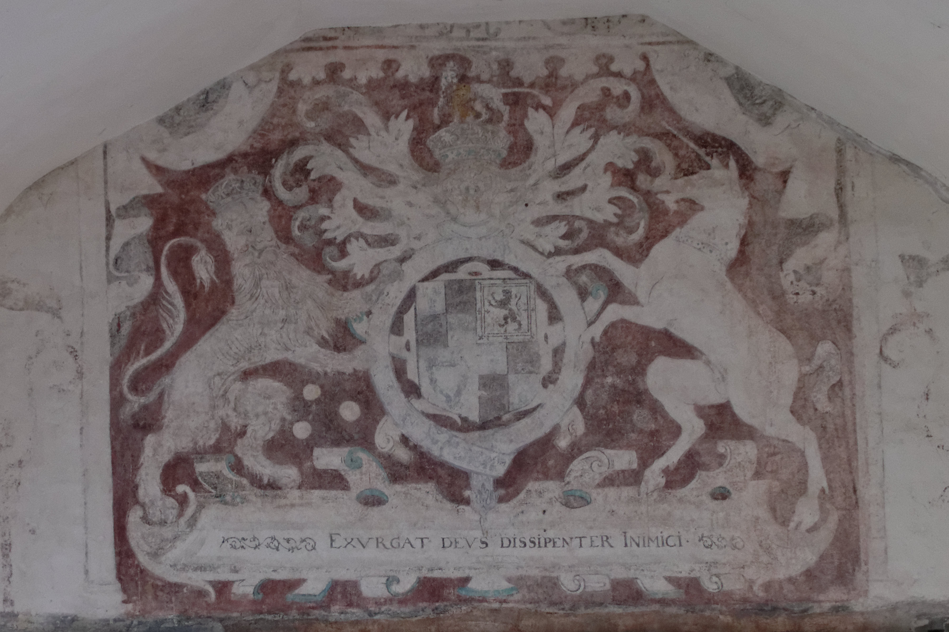 The Royal Arms of King James I who ruled from 1603 - 1625. The painting extends above the current ceiling level: the ceilings were plastered during the 18th century. At some point the painting was limewashed out and the tympanum appeared bare. The arms were rediscovered and conserved in 1986.