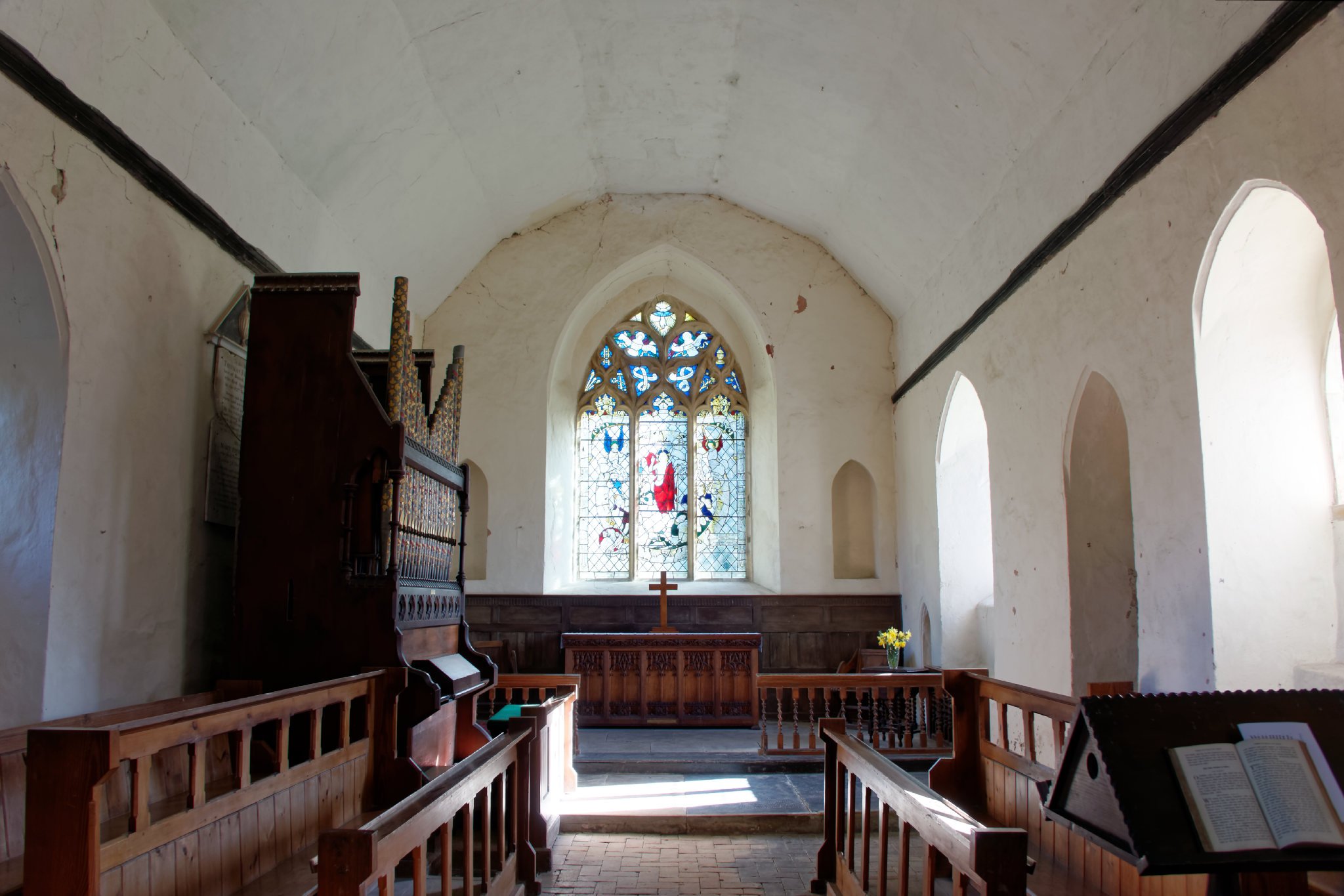 The chancel is 14th century. The ceilings were plastered during the 18th century, hiding the 14th century roof timbers. The panelling behind the altar is early 17th century, the communion rails, late 17th century. The Bevington organ was installed in 1877. The east window was replaced in 1928 in 14th century style with new stained glass. The altar itself was given to the church by Thomas and Sarah Daniell in 1913.