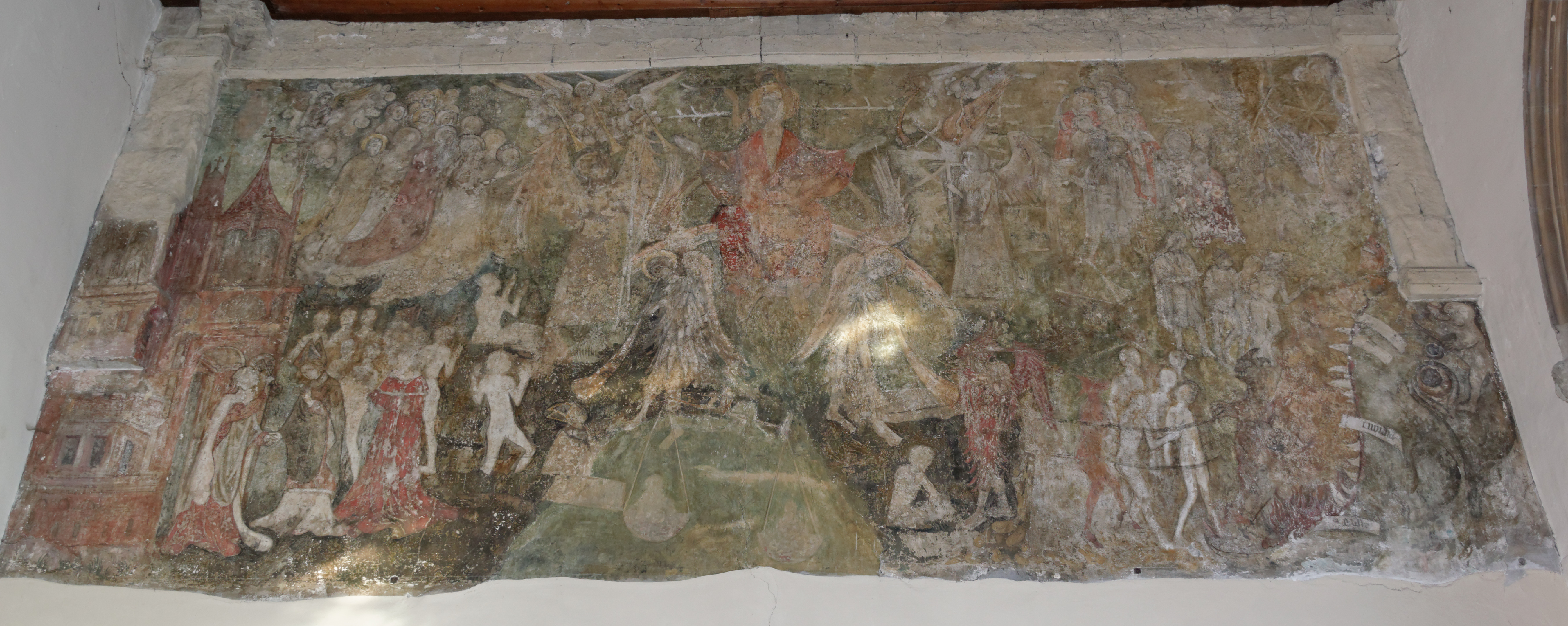This early fifteenth century Doom painting shows the Day of Judgement. It was covered up with whitewash during the reformation and only rediscovered in 1876